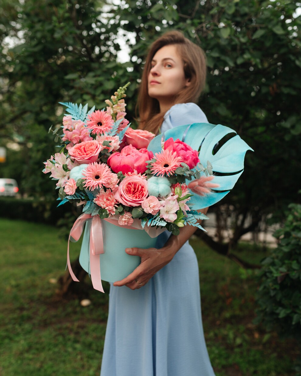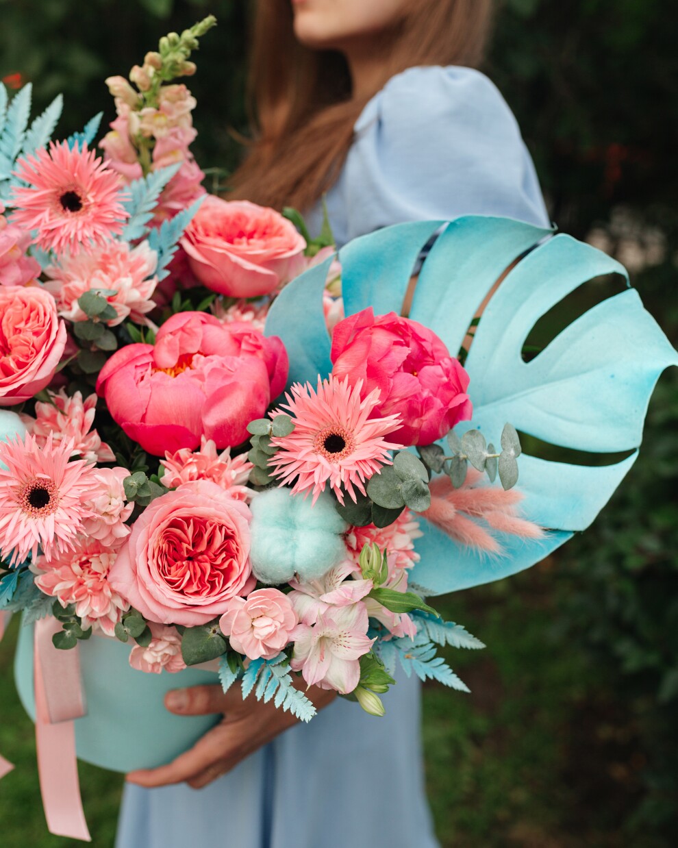 Яркая авторская композиция с экзотическим характером. Главный акцент — пышные коралловые пионы в окружении нежно-розовых цветов. Особый стиль букету придают голубые детали и архитектурный лист монстеры, который эффектно подчеркивает сочность красок