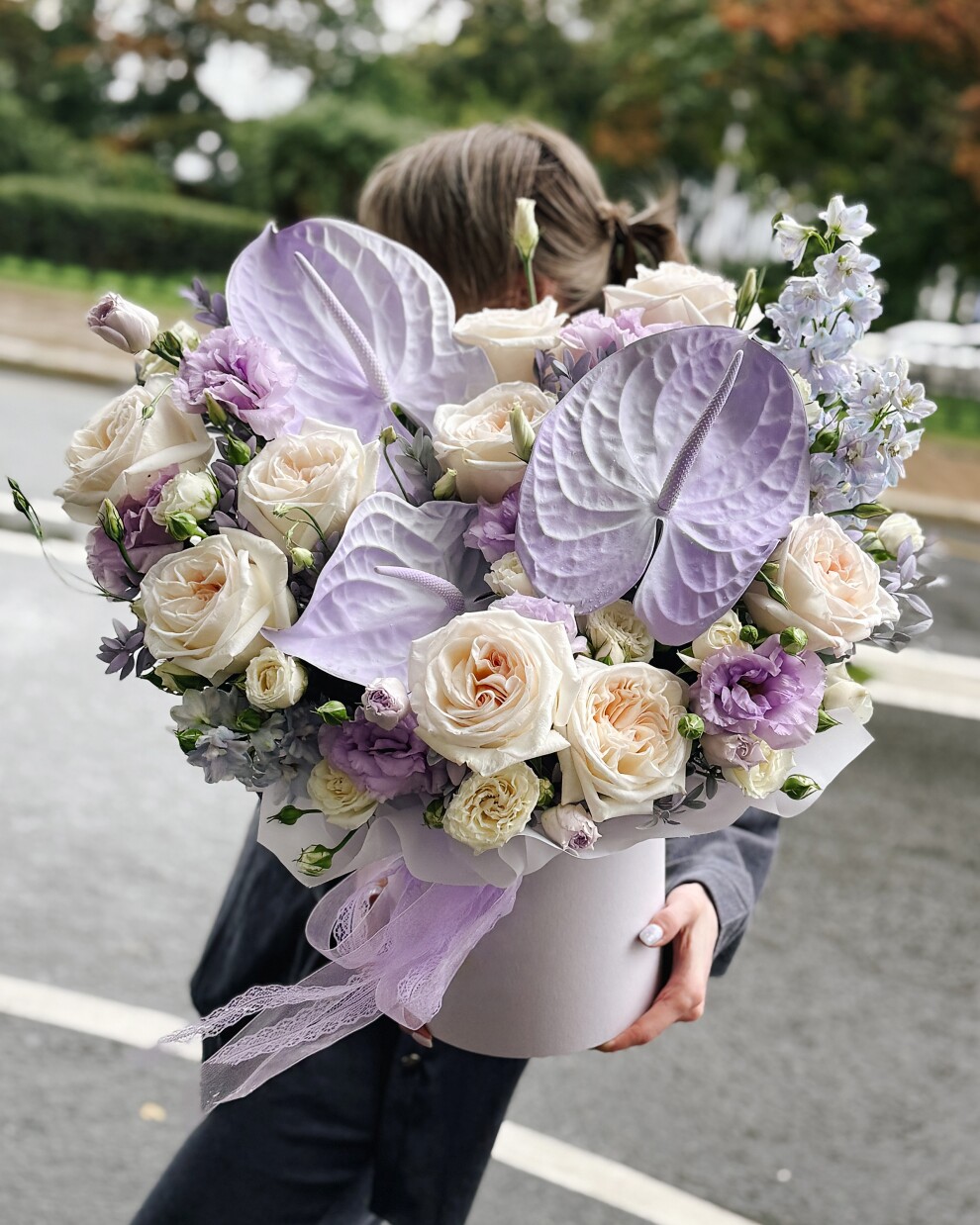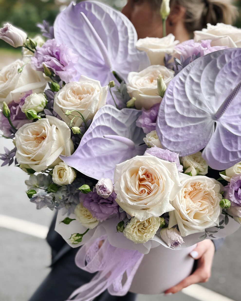 Изысканная авторская композиция, воплощающая хрупкость и утонченную красоту. Центром букета стали пышные белые пионовидные розы с их безупречной многослойной фактурой, напоминающей тончайший фарфор.Главный акцент - глянцевые антуриумы нежного сиреневого оттенка, которые добавляют композиции современный стиль и характер
