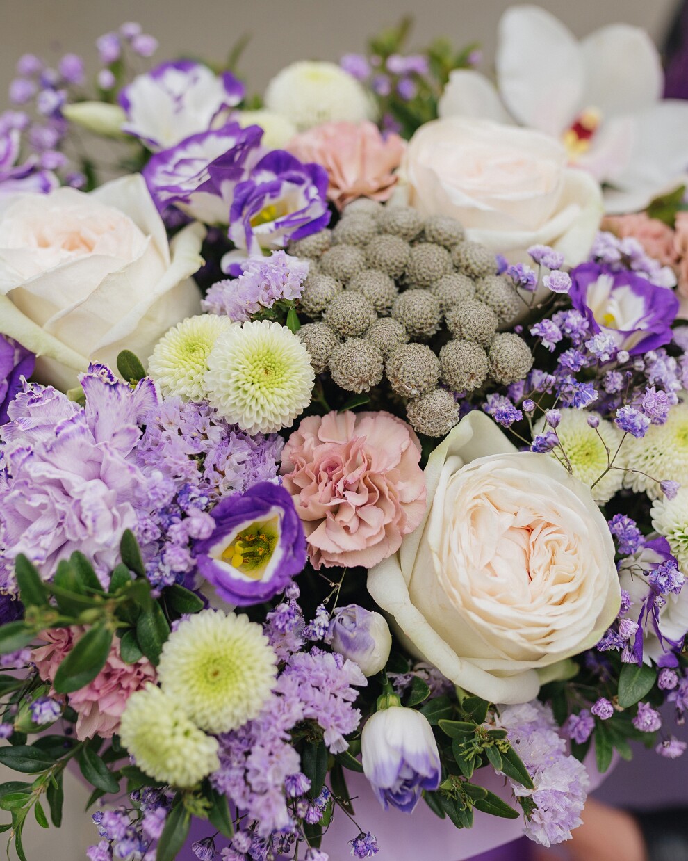 Завораживающая авторская композиция в глубоких фиолетовых тонах с освежающими белыми акцентами. Главная изюминка этого букета - экзотическая серая бруния в центре. Её серебристые шарики, похожие на капли застывшего инея, добавляют флористической истории особый стиль и фактурность