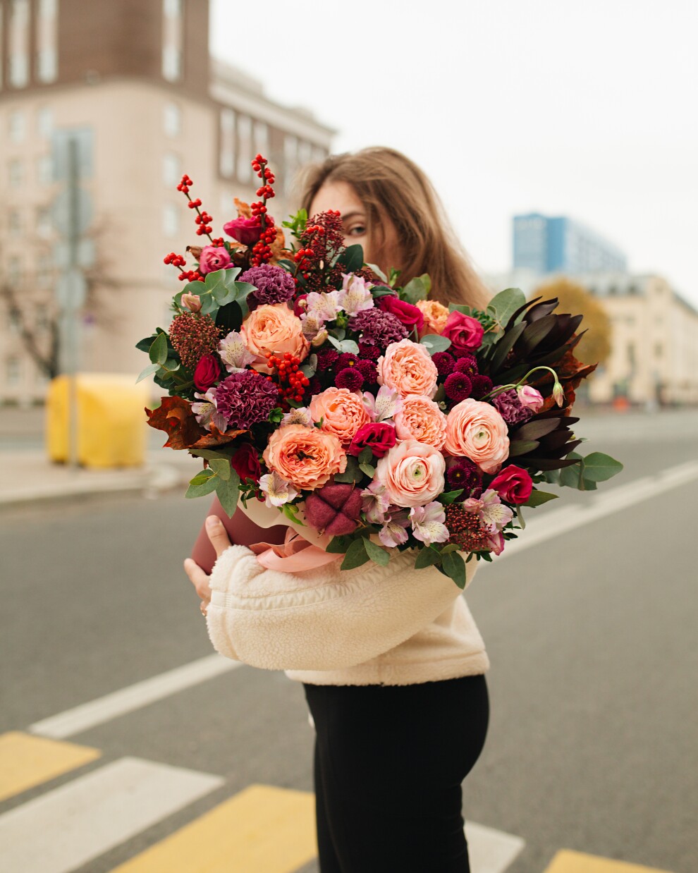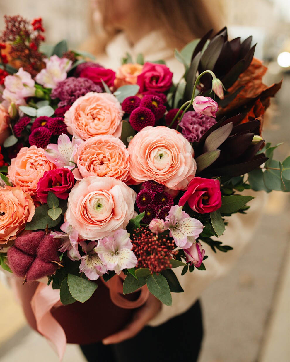 Эта композиция построена на эффектном контрасте - нежности персиковых бутонов и глубокой, «винной» энергии бордовых акцентов. Илекс и декоративные детали добавляют ей осеннего уюта и авторского стиля, а пионовидные одноголовые и кустовые розы лёгкости и очарования