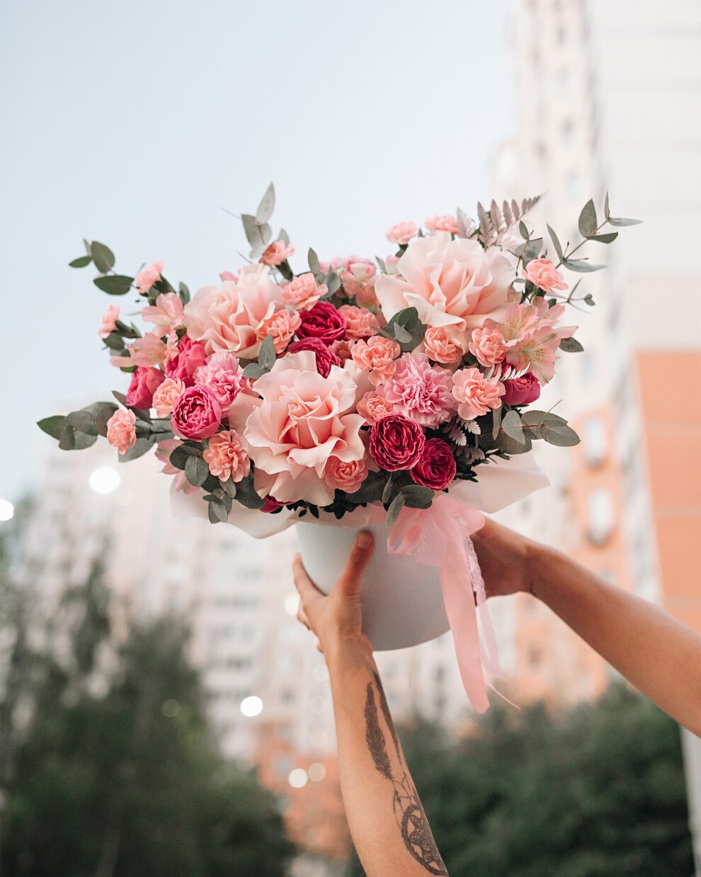 Флористический шедевр для тех, кто следит за модой. Главная изюминка этой композиции - французские вывернутые розы, которые выглядят максимально пышно, напоминая экзотические пионы. Мы создали уникальную игру контрастов, объединив в одном букете теплые и холодные оттенки розового. Нежная мятно-голубая коробка подчеркивает яркость цветов, делая их еще более сочными