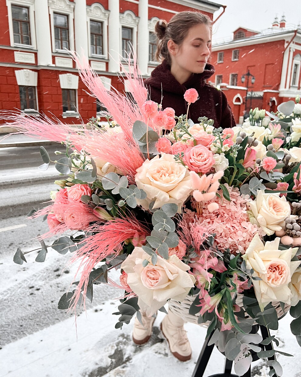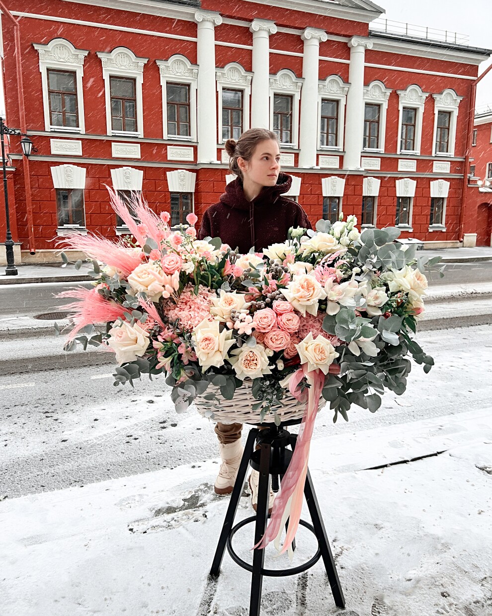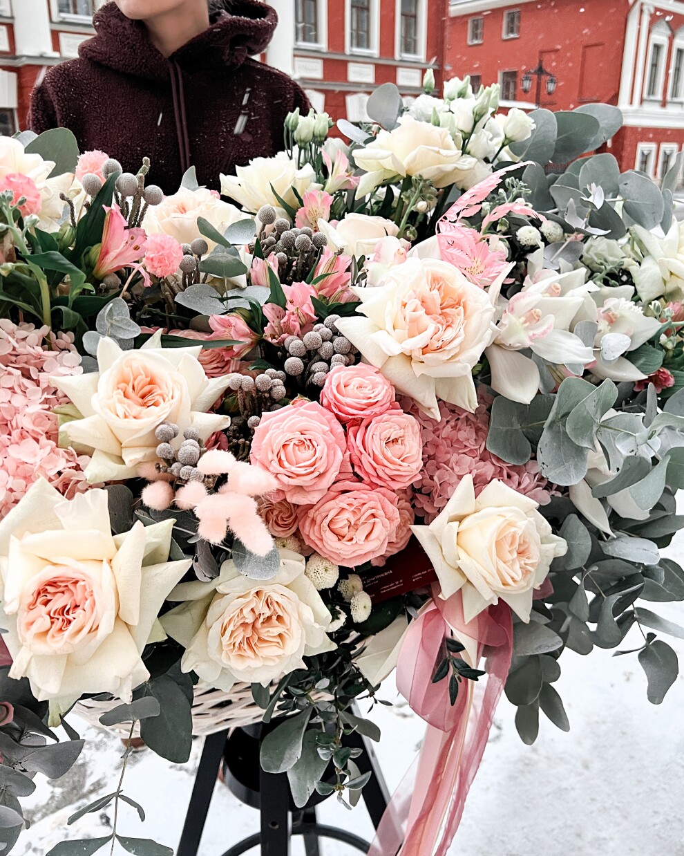 Представляем вам эксклюзивную авторскую корзину, созданную нашими ведущими флористами. Эта композиция в утонченной нежно-розовой и кремовой палитре - воплощение легкости, воздушности и весеннего очарования. Она станет идеальным подарком для самых особенных моментов