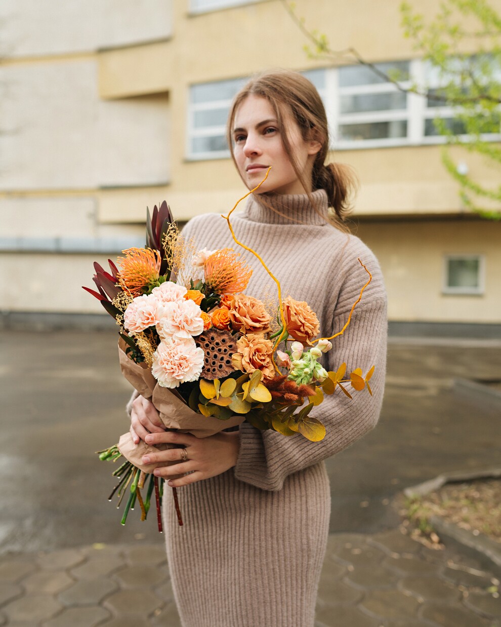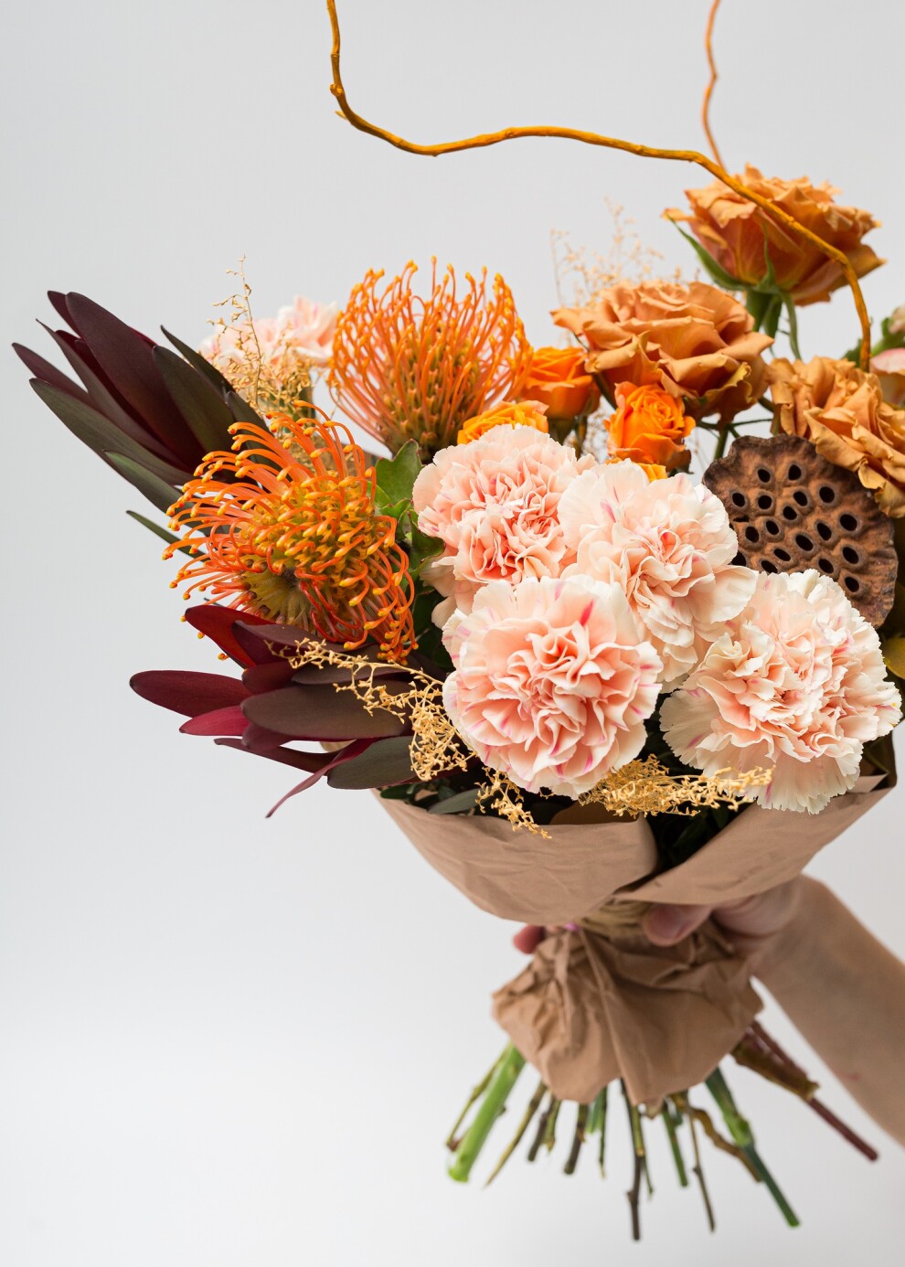 Изысканная и фактурная композиция, построенная на игре контрастов и форм. Нутан привносит в палитру теплоту спелого персика и рыжей охры, а тщательно подобранные экзотические детали создают сложный, многогранный силуэт. Этот букет не просто красив - он интересен с точки зрения дизайна