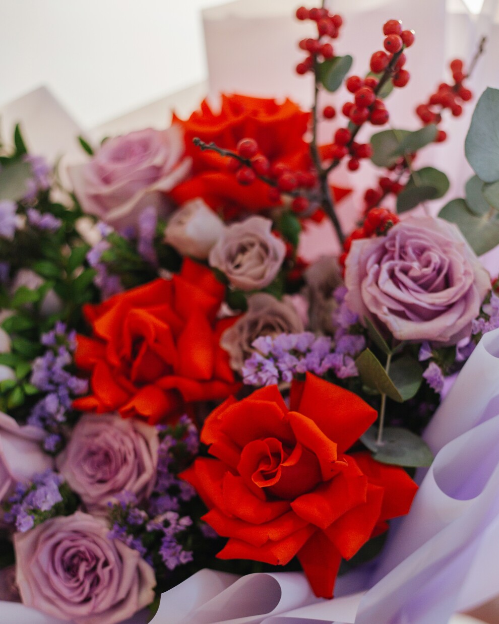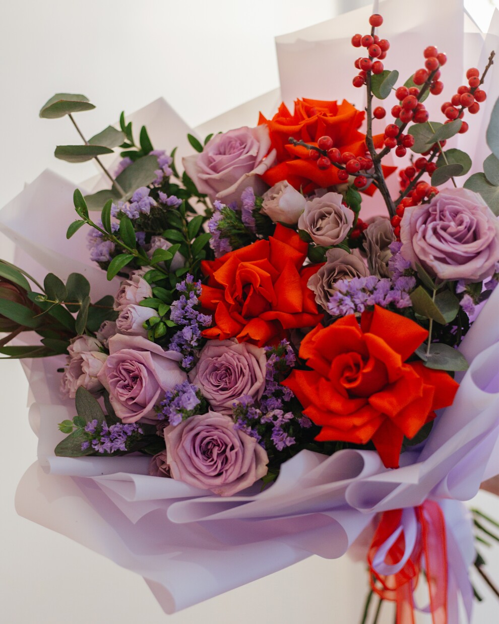 Погрузитесь в глубину и страсть с этим величественным авторским букетом. Сочетание бархатных фиолетовых оттенков и пламенного алого создает драматичный, притягательный образ