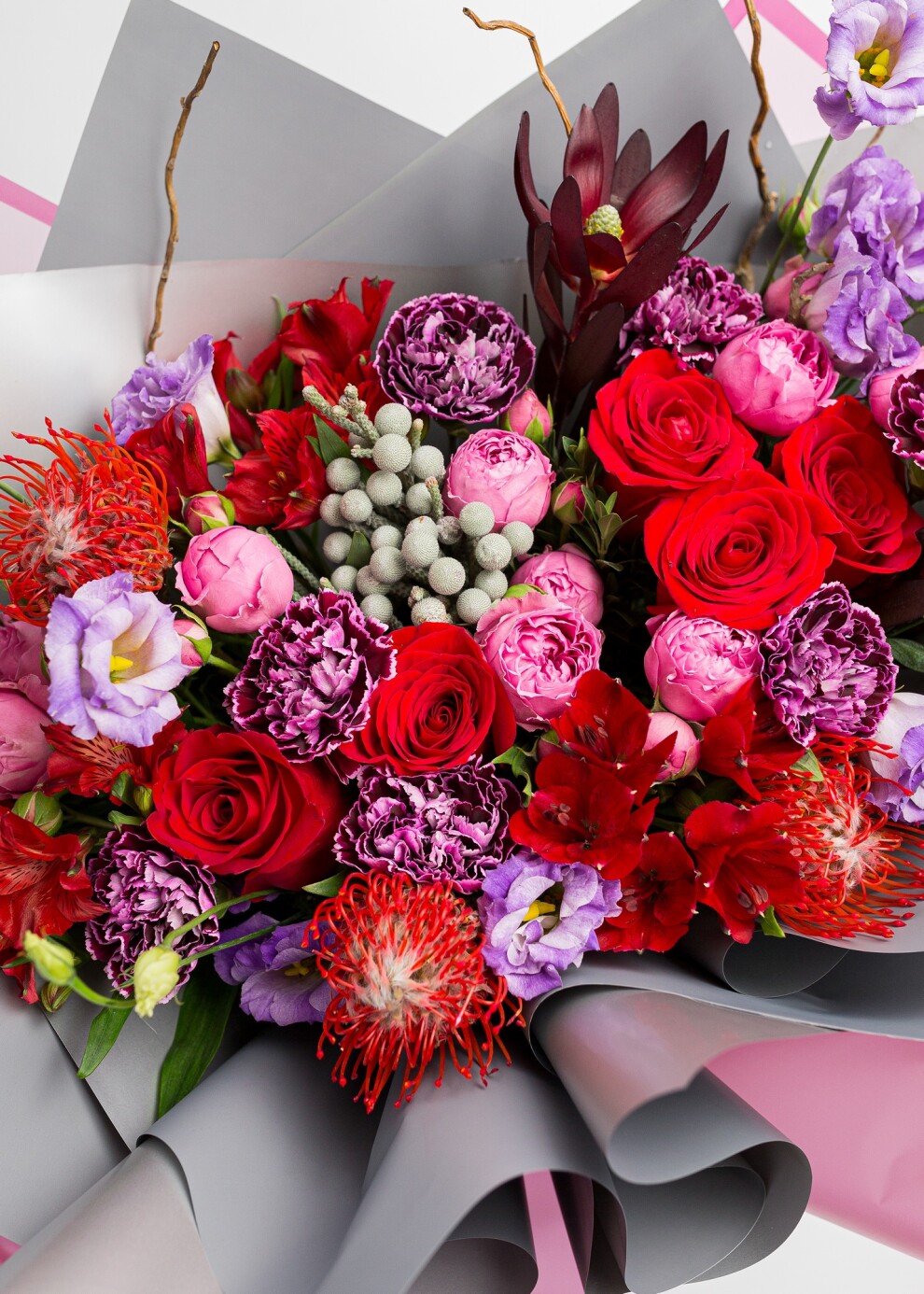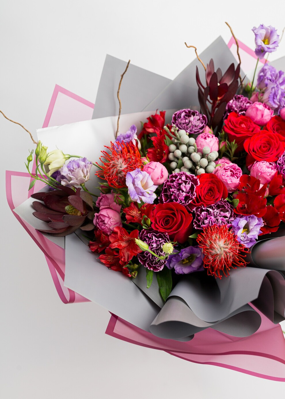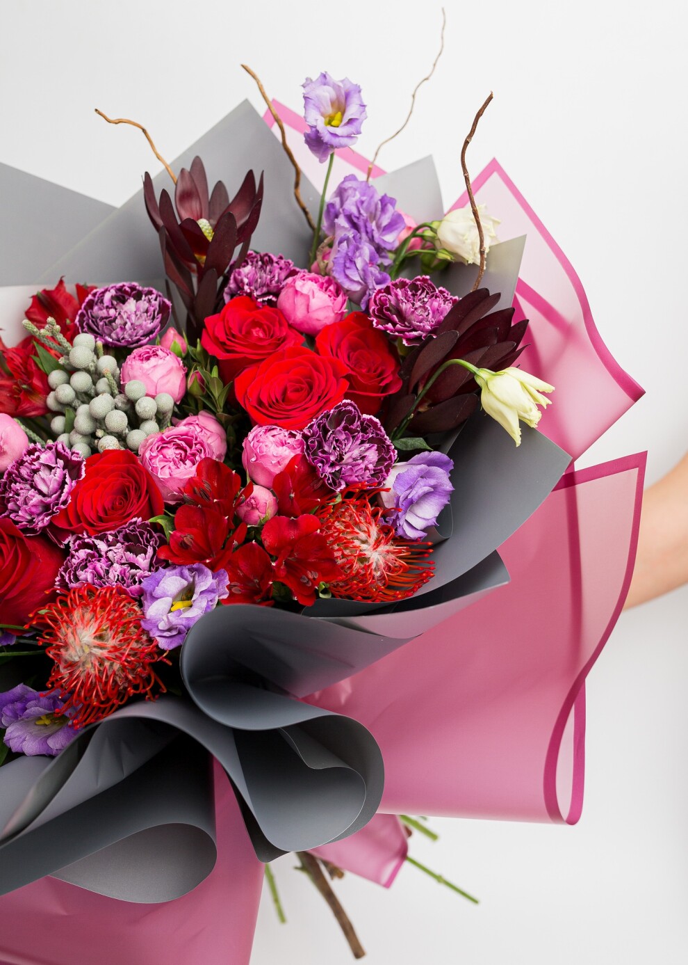 Этот величественный букет в оттенках спелой вишни и сочной малины создан для тех, кто ценит глубину и характер. Насыщенная палитра «Бургунди» в сочетании с ягодными акцентами создает эффект обволакивающего тепла и роскоши. Плотные бутоны роз, фактурные и экзотические цветы превращают композицию в настоящее произведение искусства