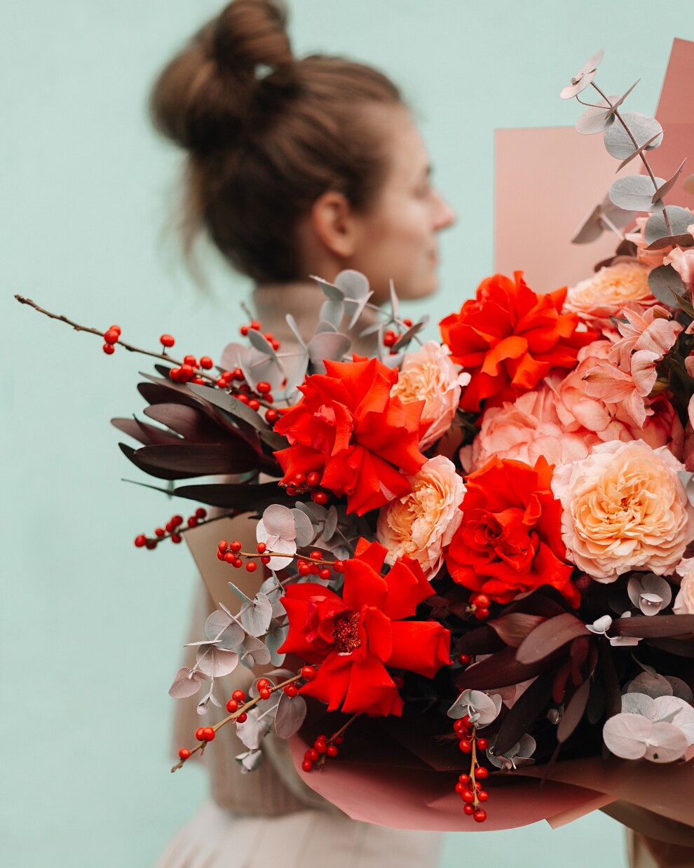 Этот эффектный авторский букет сочетает в себе классическую страсть и современную флористическую эстетику. Контраст глубокого алого и мягкого персикового создает многогранную композицию, которая выглядит одновременно статусно и нежно