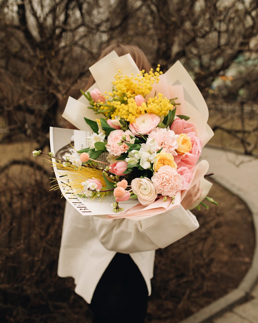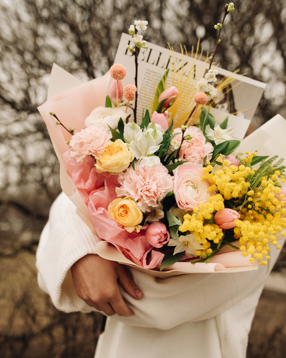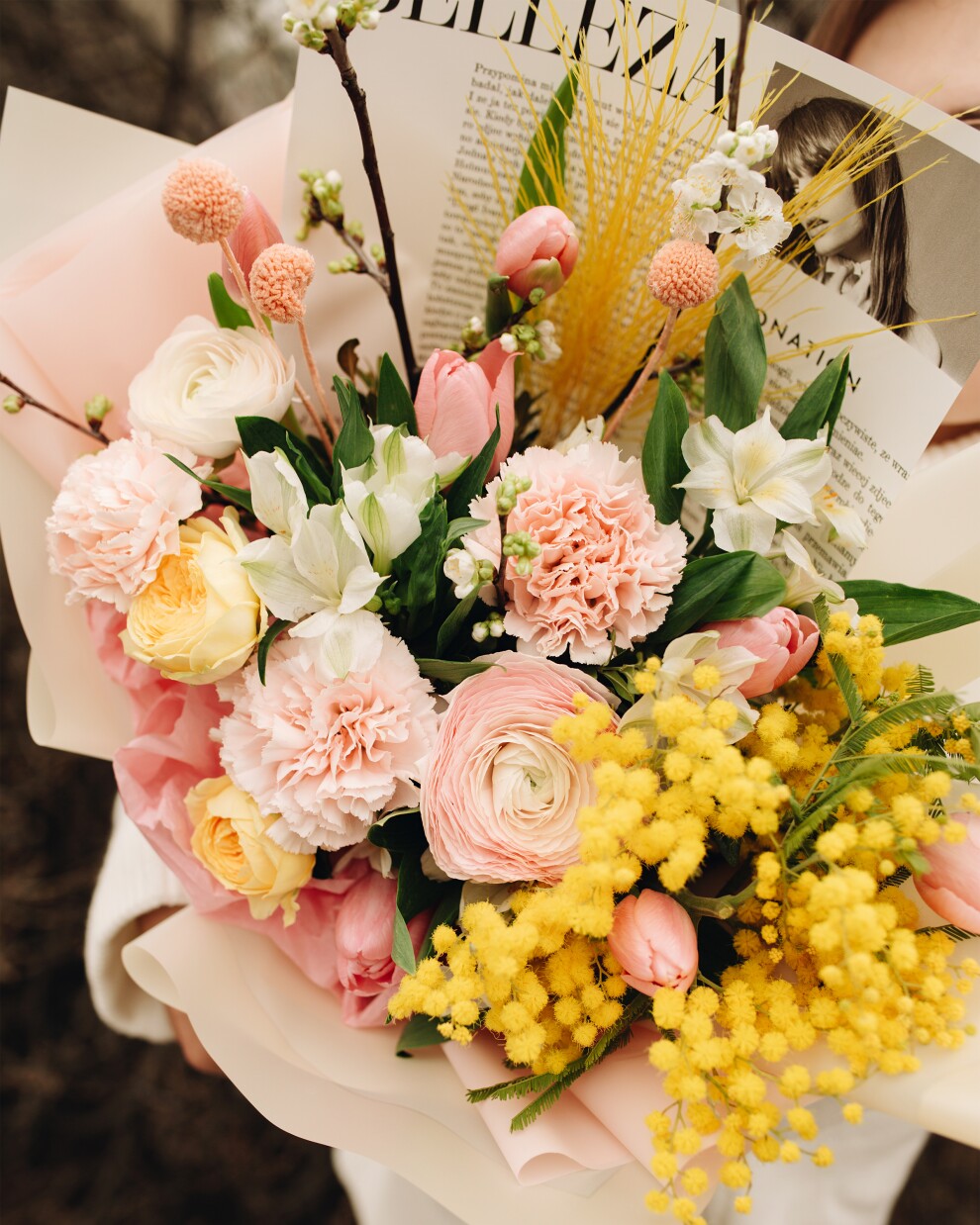 Почувствуйте, как тает снег, с этим нежным весенним букетом. Пушистые шарики мимозы напоминают о первых лучах солнца, а изящные ранункулюсы и розовые тюльпаны добавляют композиции легкости и свежести. Это идеальный подарок, чтобы поздравить с 8 Марта, днем рождения или просто напомнить о скором приходе весны