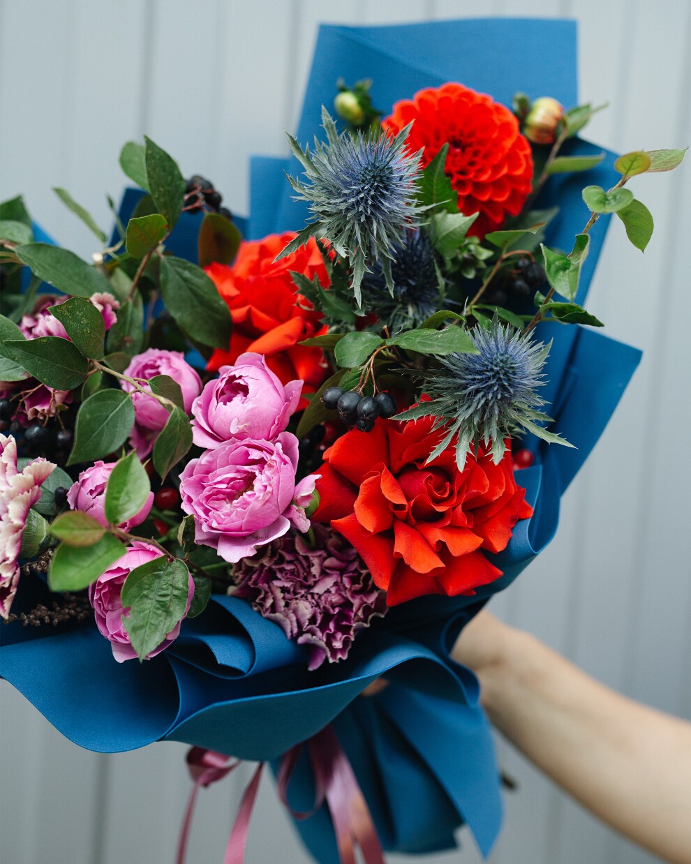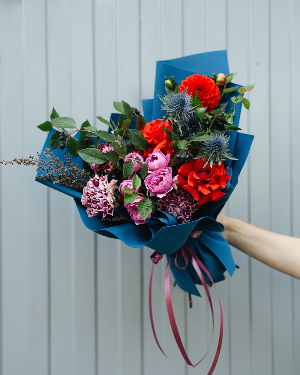 Взрыв цвета и стиля! Этот букет построен на эффектном контрасте горячего малинового, алого красного и холодного, глубокого индиго. Пышные розы сияют особенно ярко на фоне строгой темно-синей упаковки. Это не просто цветы, а дизайнерское заявление, которое подойдет для самых ярких событий и неординарных личностей