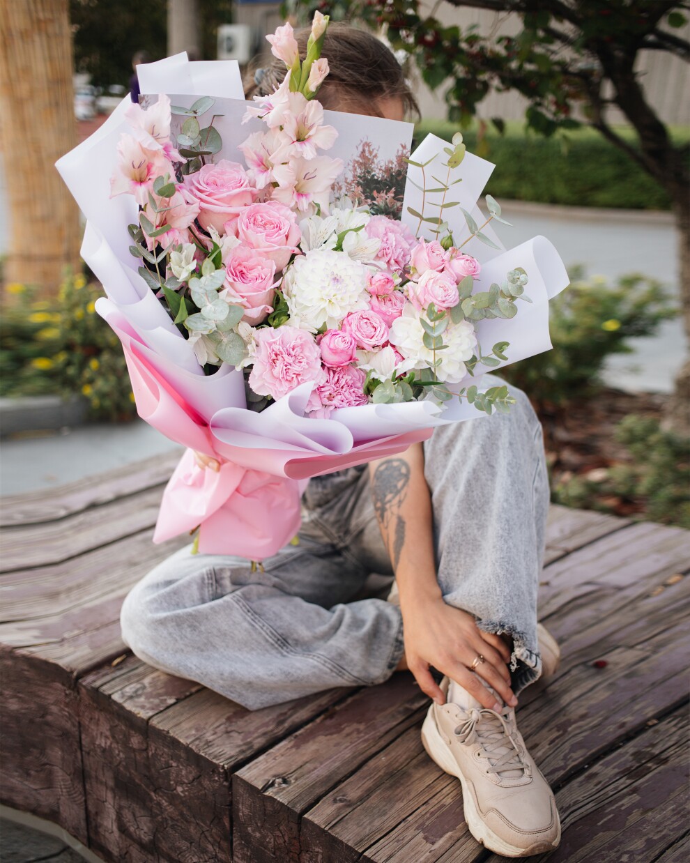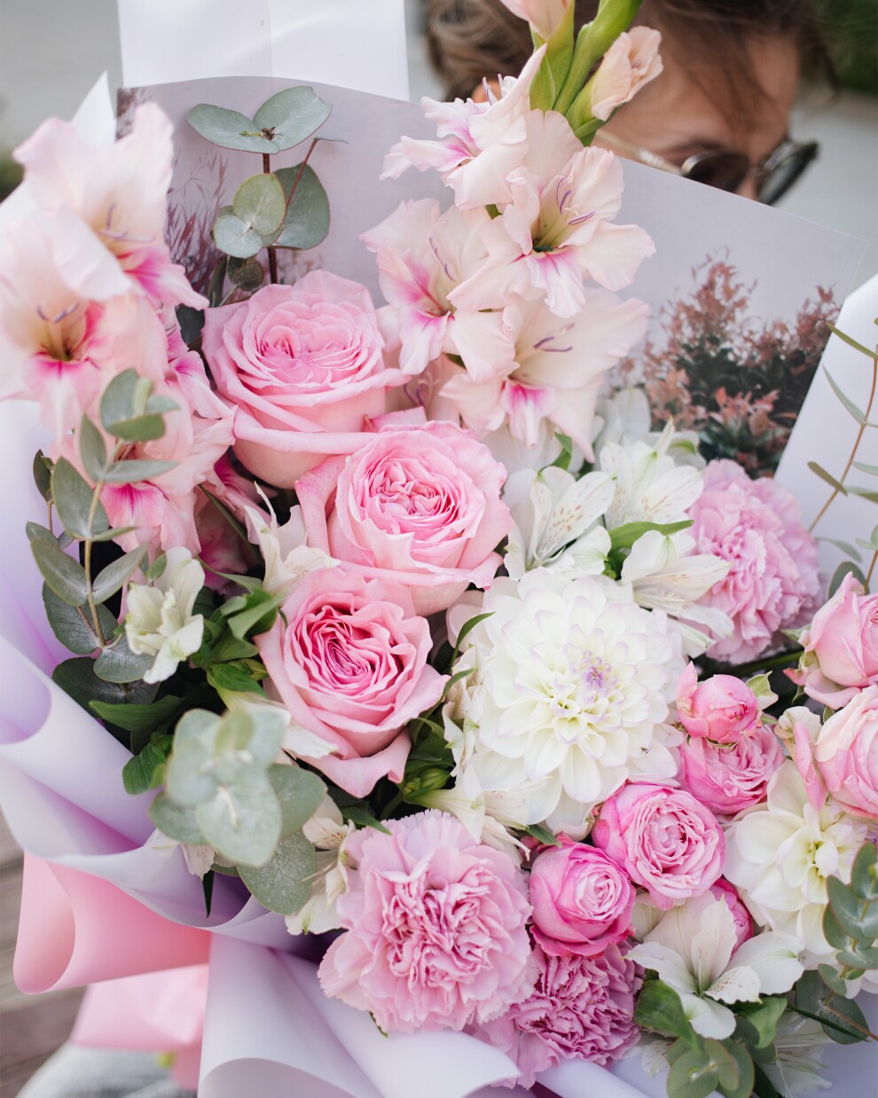 Букет в изысканной розовой палитре с холодным подтоном. Такая цветовая гамма выглядит современно и свежо, сохраняя при этом романтичное настроение
