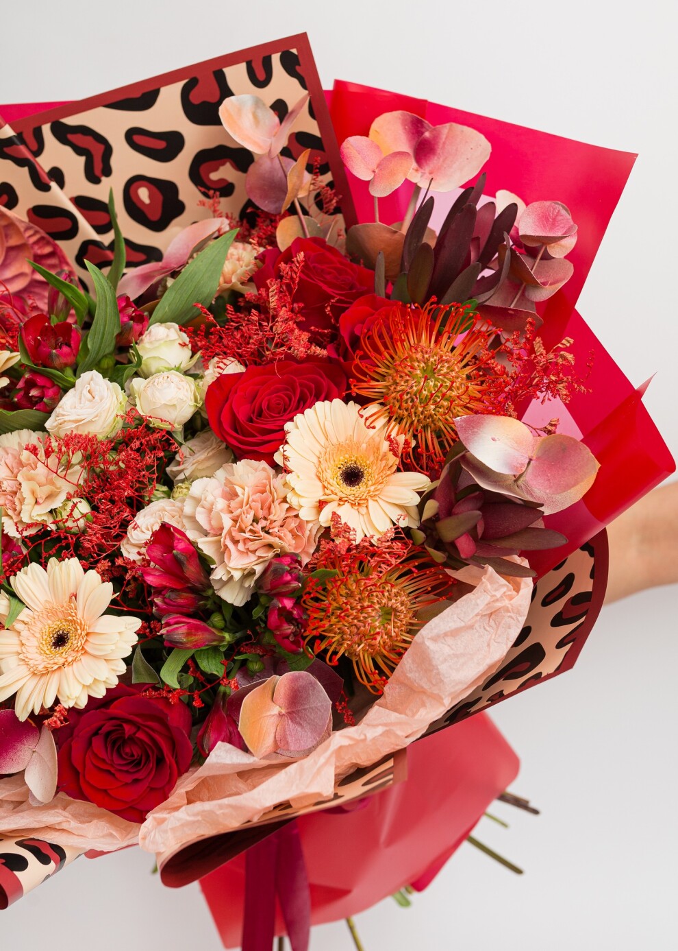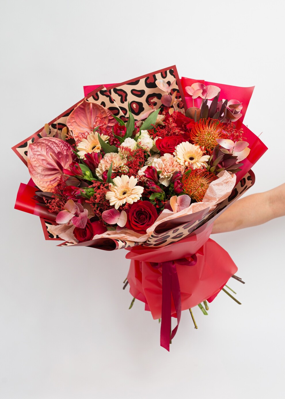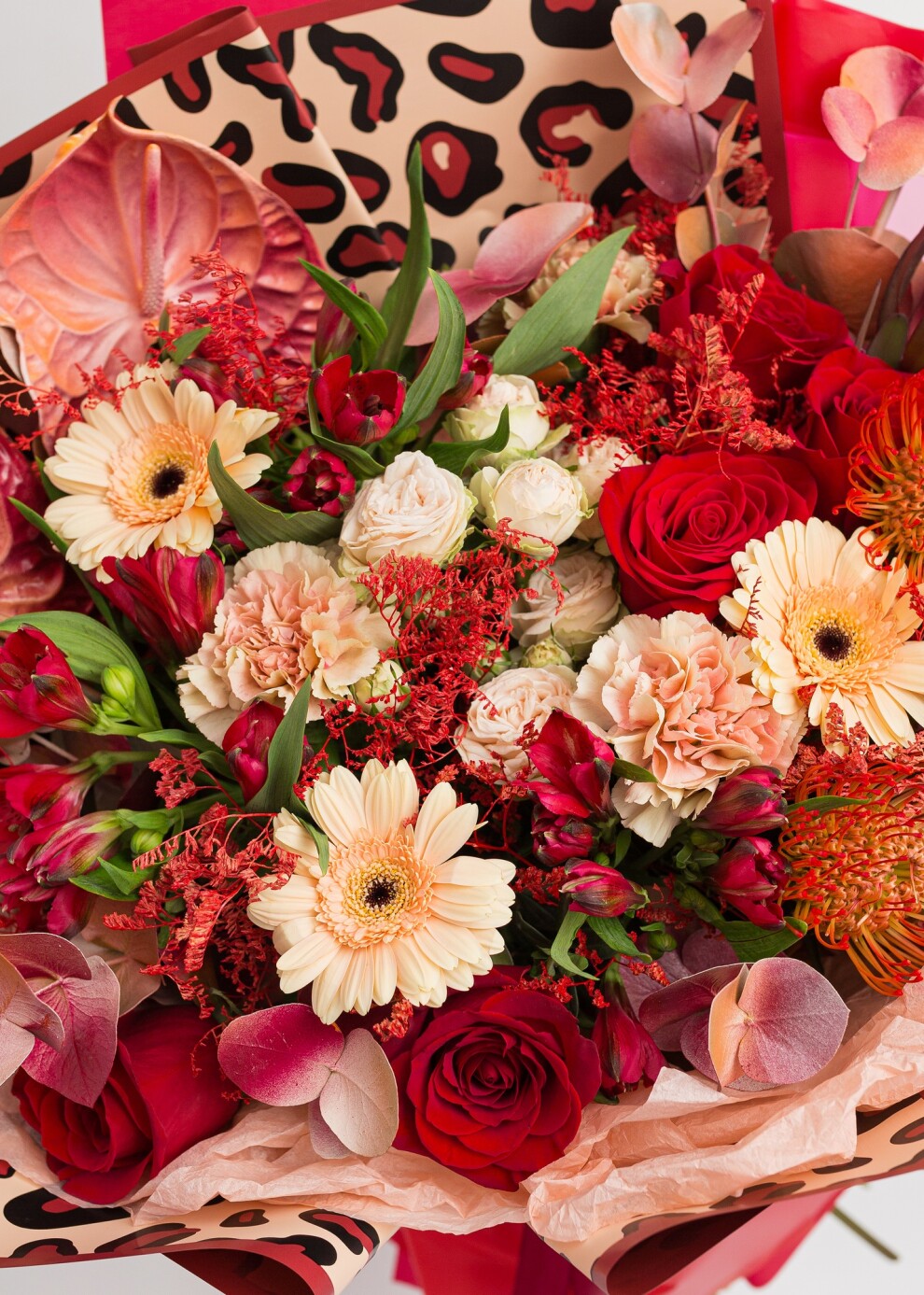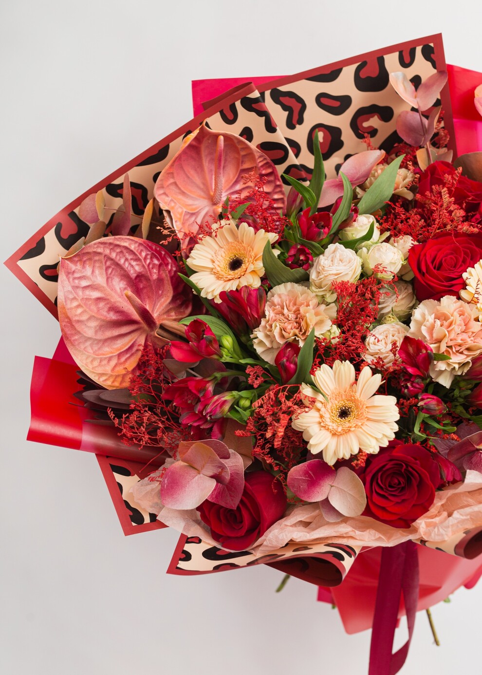 Почувствуйте жар африканского солнца в этой грандиозной композиции. Доминирующий алый цвет подчеркнут глянцевым блеском экзотических антуриумов, а нежные персиковые нотки гермини добавляют букету объем и мягкое внутреннее сияние. Главный штрих - дизайнерская упаковка с принтом «под шерсть барса», которая превращает флористику в высокий стиль