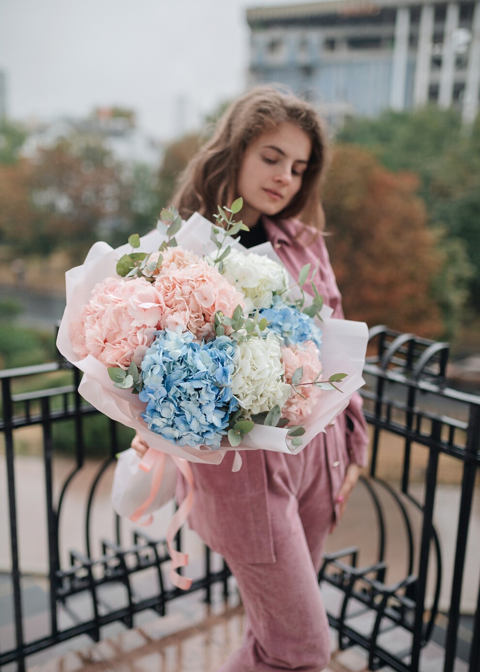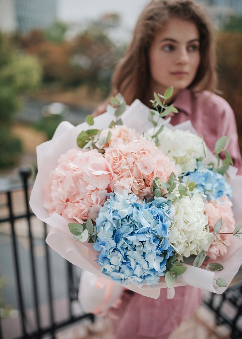 Моно-букет из разноцветных гортензий с эвкалиптом - 7шт.