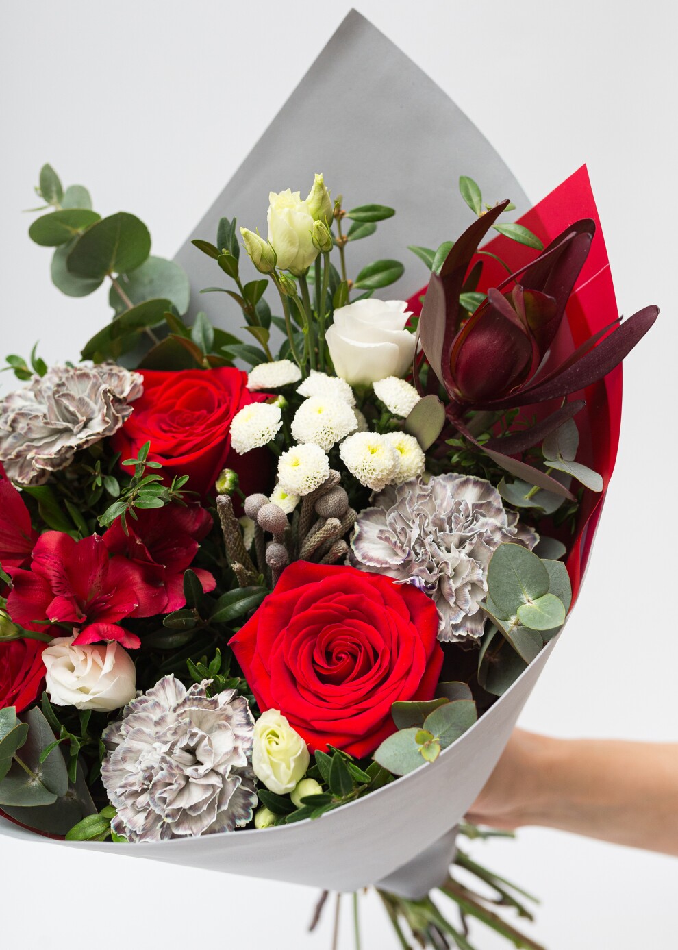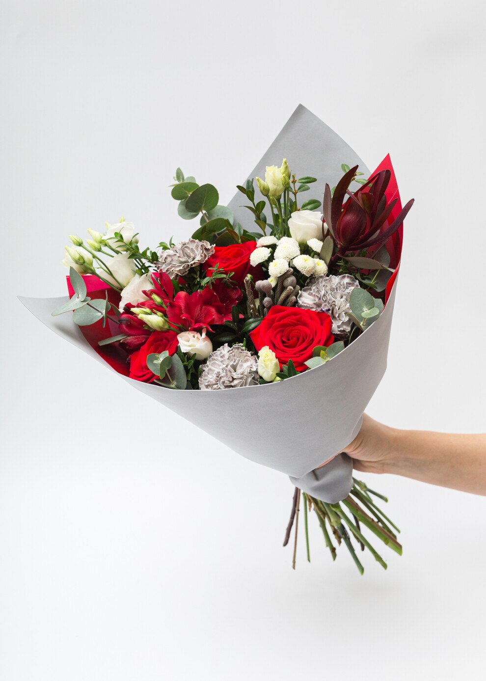 Средний букет с экзотичными деталями в нашем фирменном оформлении