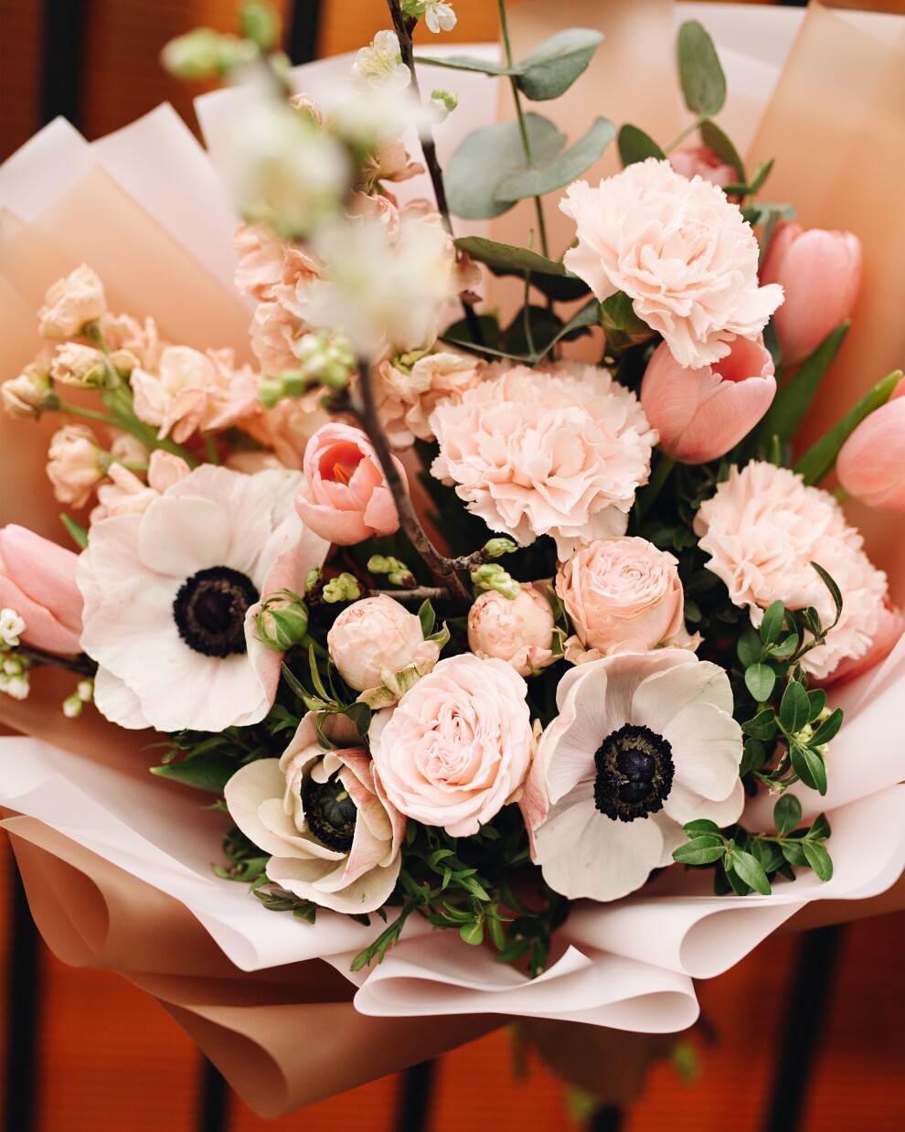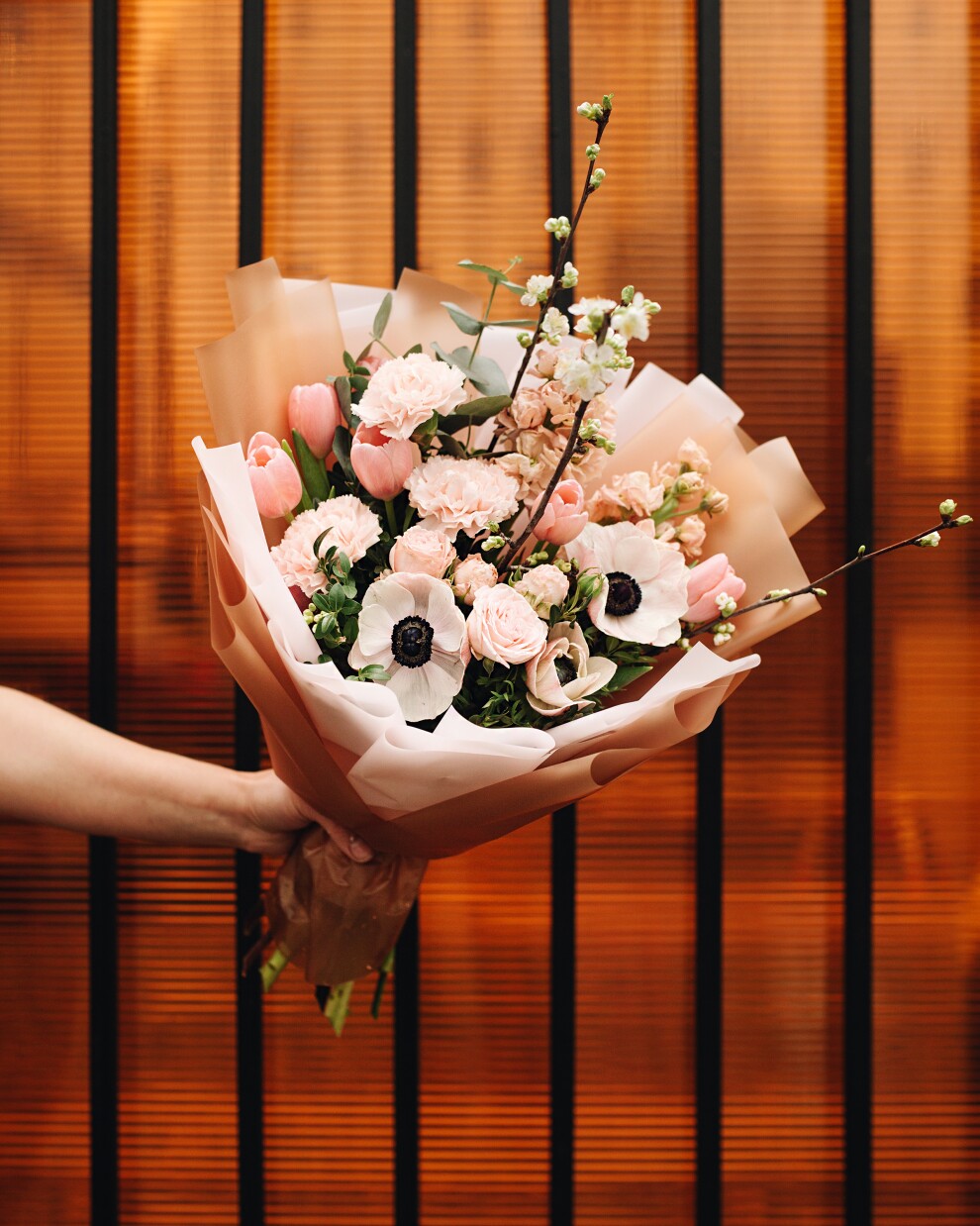 Природа живая и уникальная, поэтому создать два абсолютно одинаковых букета невозможно. Оттенки и форма цветов могут немного отличаться от фото, но мы гарантируем, что сохраним гамму, стиль и основной состав вашего букета. Тюльпаны, анемоны и ветви вишни имеют выраженную сезонность (преимущественно весенний период). В остальное время года наличие конкретных сортов и актуальную стоимость просим уточнять у менеджера перед оформлением заказа. Благодарим за понимание!