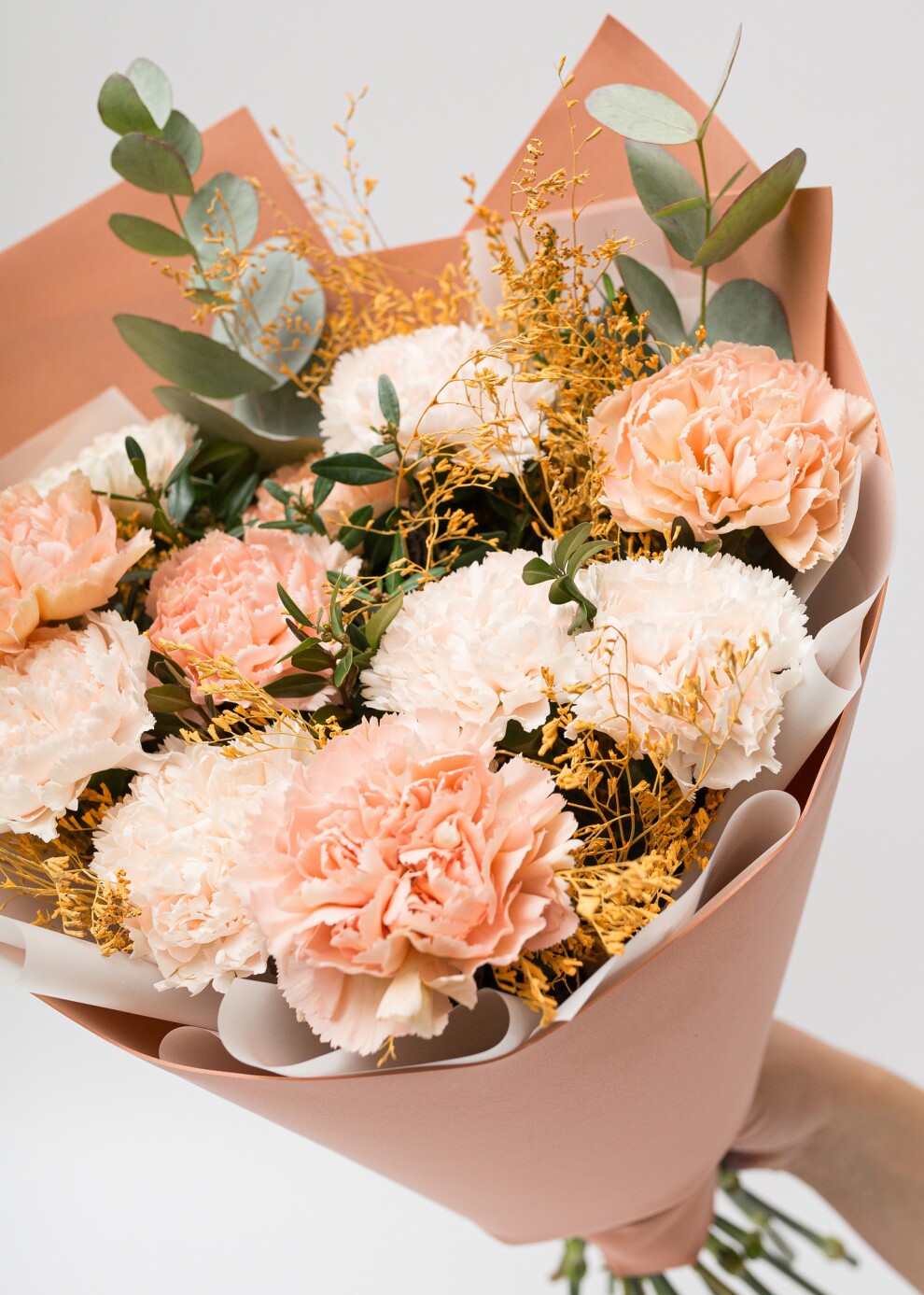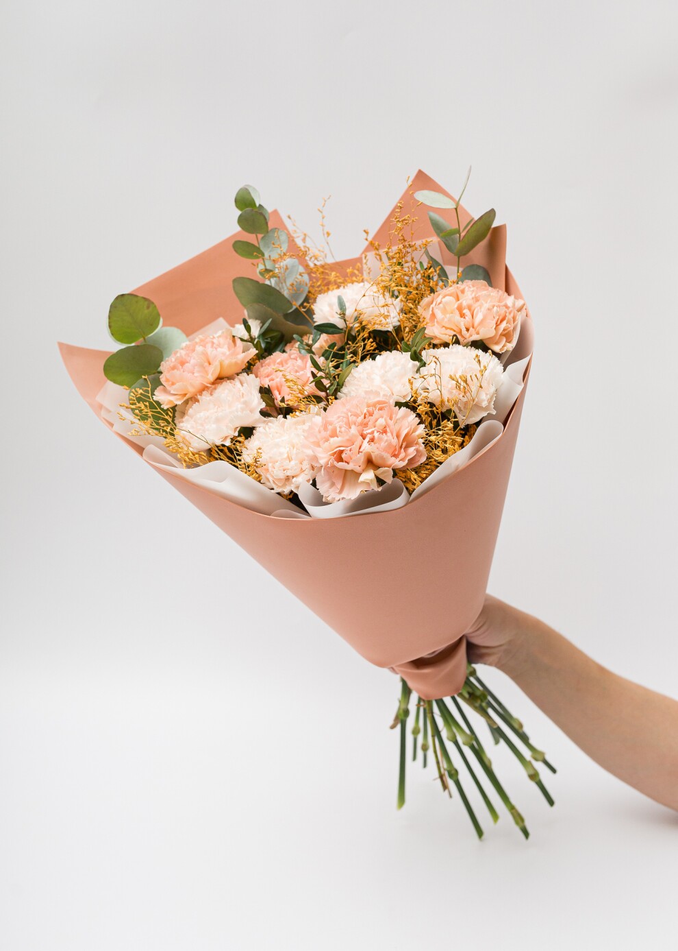Моно-букет из гвоздик с лимониумом и эвкалиптом