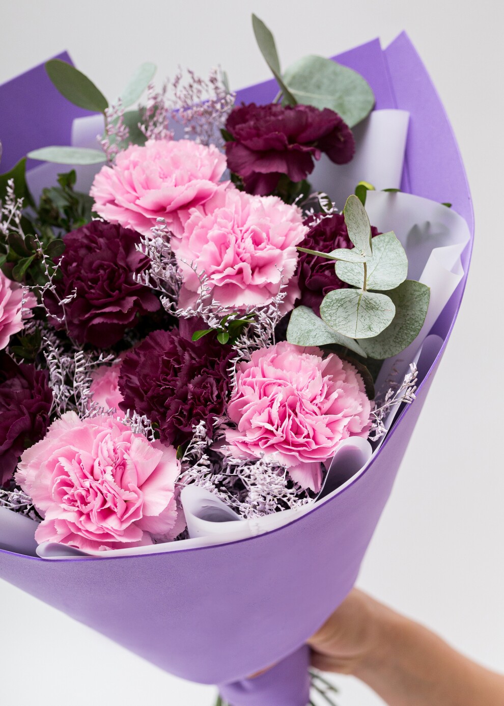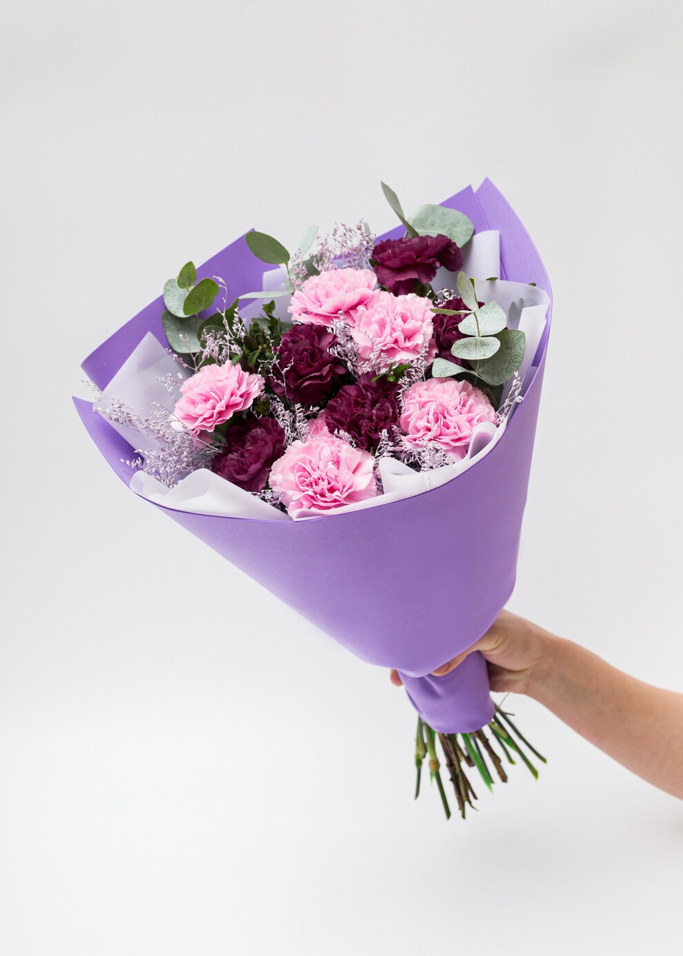 Моно-букет из гвоздик с лимониумом и эвкалиптом