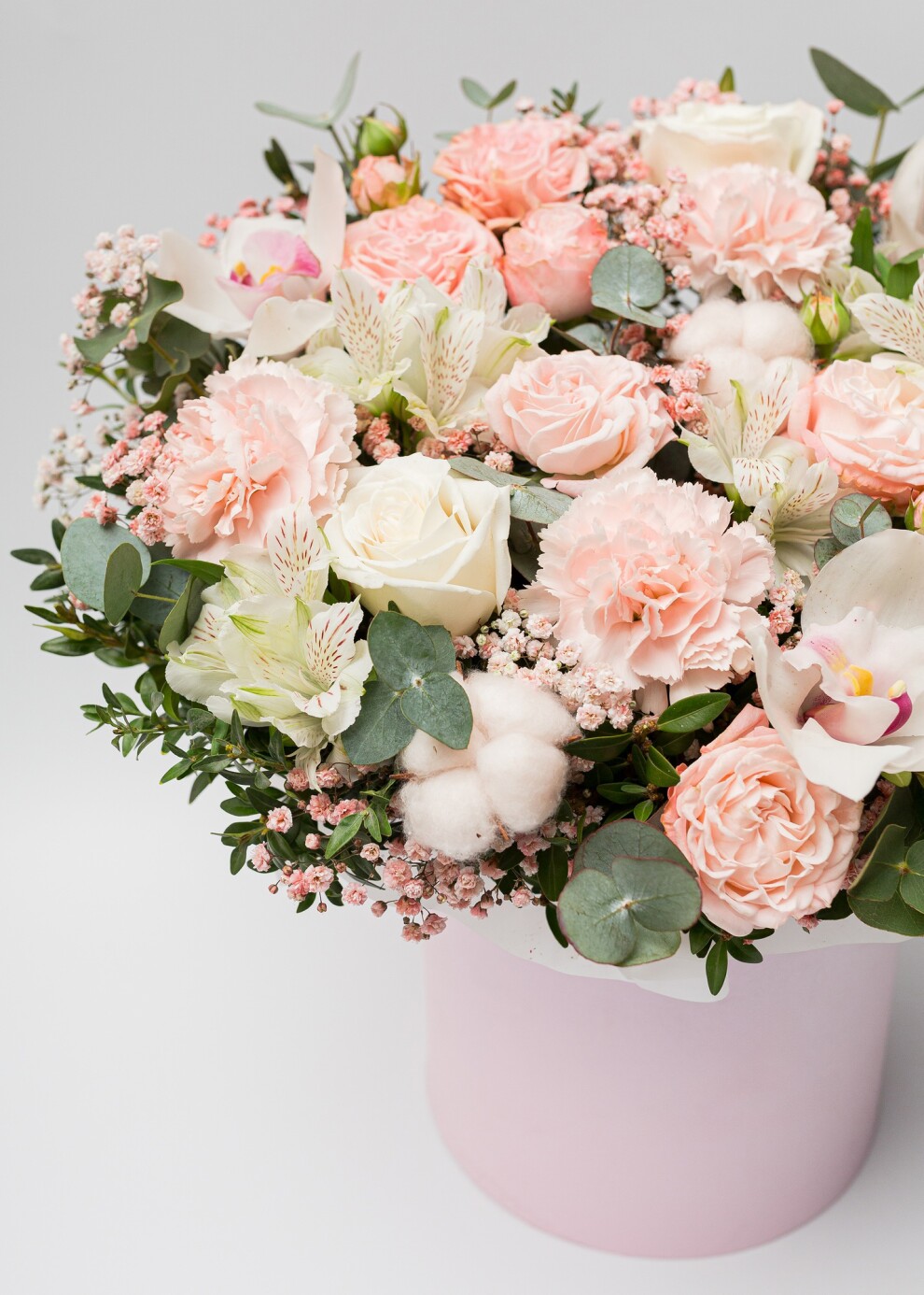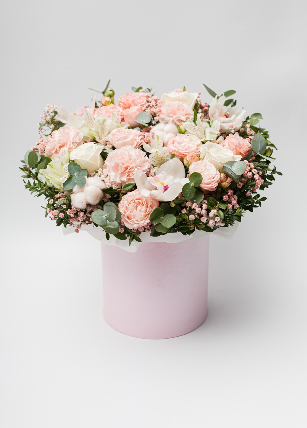 Нежное и спокойное бело-розовое сочетание в шляпной коробке