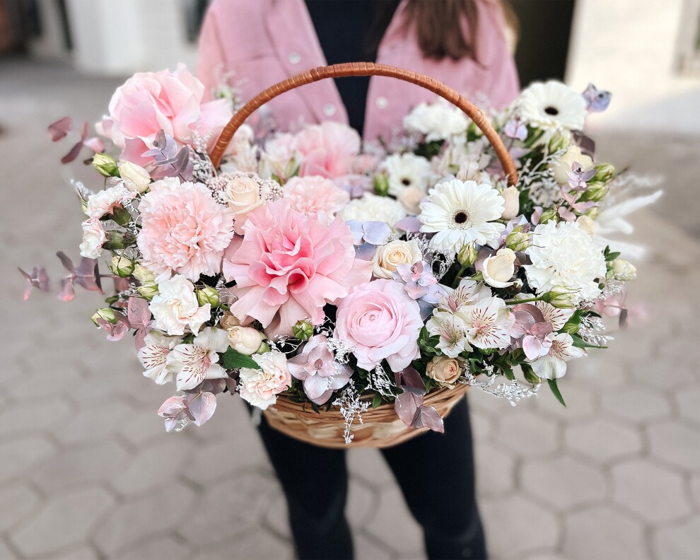 Очаровательная и воздушная корзина состоящая из 2-х половинок, белой и нежно-розовой, для ваших самым трепетных чувств