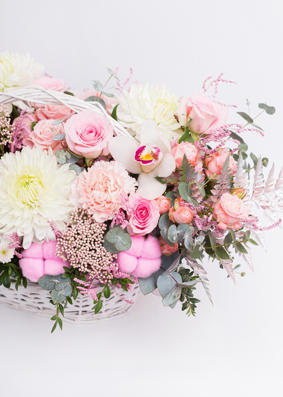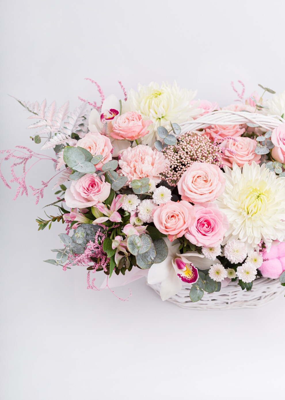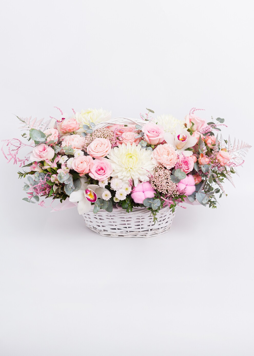 Изысканная цветочная корзина, выполненная в самых трепетных и деликатных тонах. Эта композиция в нежно-бело-розовой гамме — идеальный способ выразить самые теплые чувства, восхищение и заботу