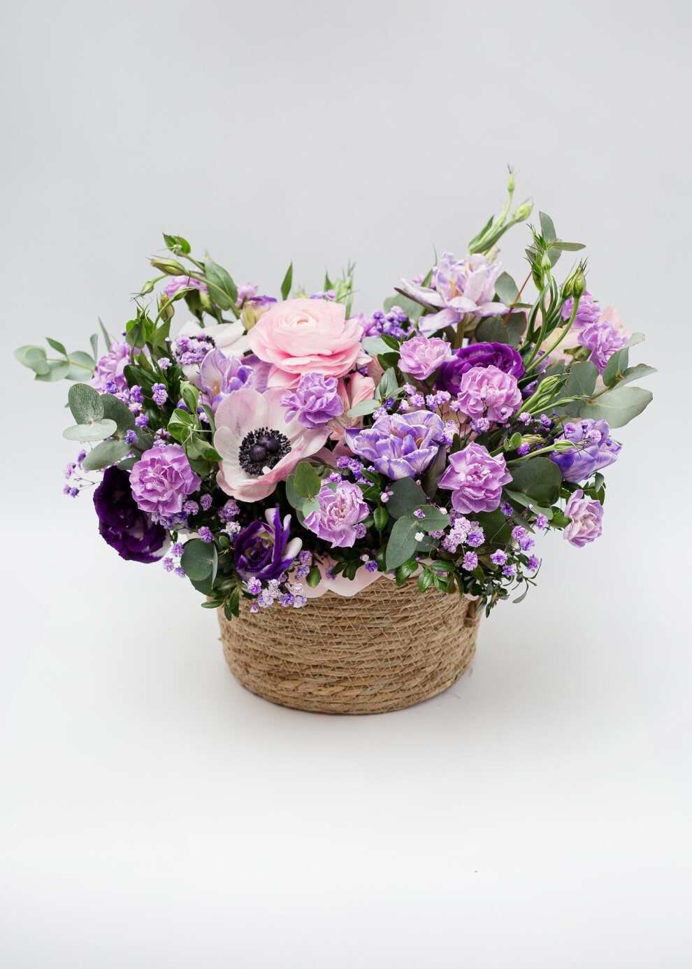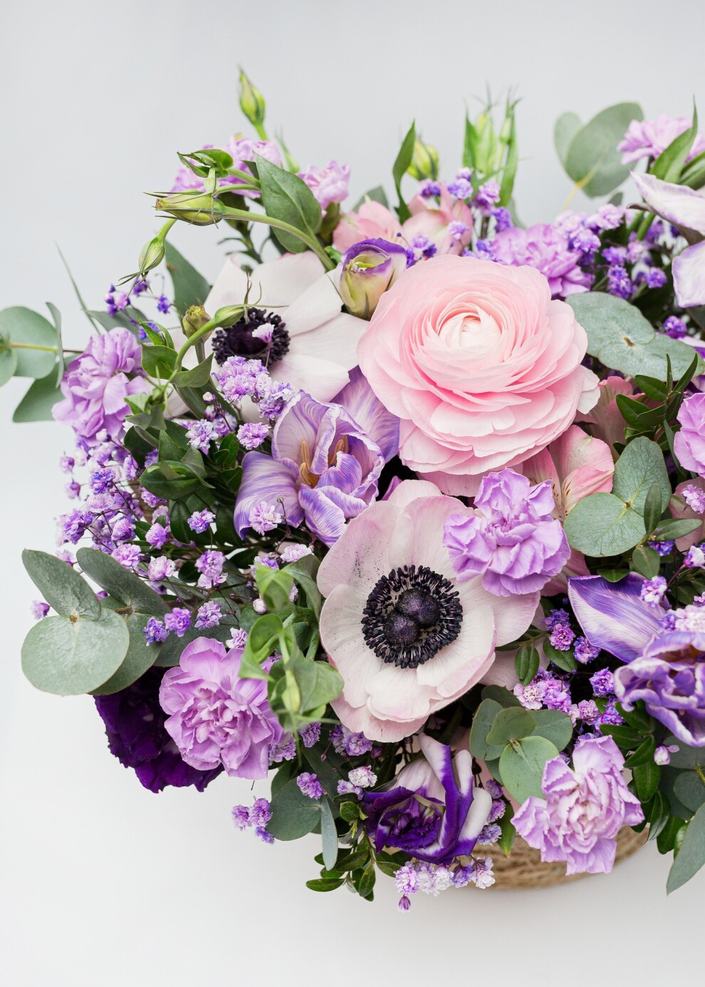 Это сочетание — воплощение таинственности и утонченной роскоши. Яркий акцент в виде розового ранункулюса на фоне глубоких фиолетовых оттенков создает эффект «свечения» внутри букета