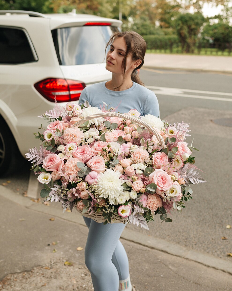 Эта изысканная цветочная корзина - воплощение чистой нежности и искренних чувств. Композиция собрана из цветов в деликатной нежно-розовой и белой гамме, создавая эффект воздушного облака