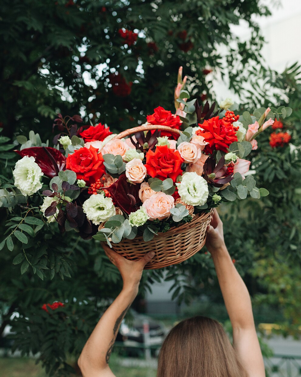 Корзина с вывернутыми красными розами в бархатном исполнении — это воплощение драматизма, роскоши и высокого стиля