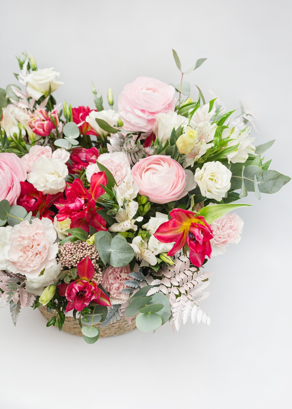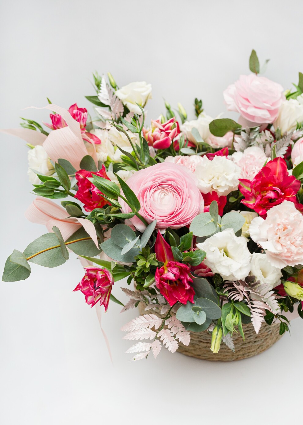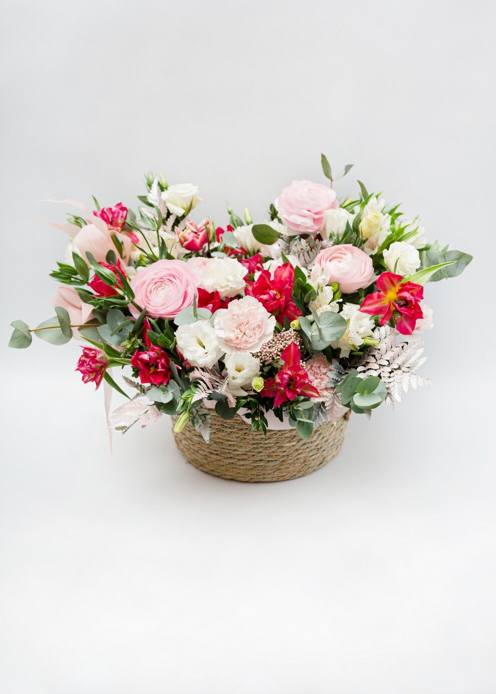 Эта изысканная корзина цветов — воплощение нежности и страсти. Мягкие, обволакивающие кремовые и пастельно-розовые тона создают ощущение воздушного десерта, а яркие вкрапления алых тюльпанов добавляют композиции характера и глубины