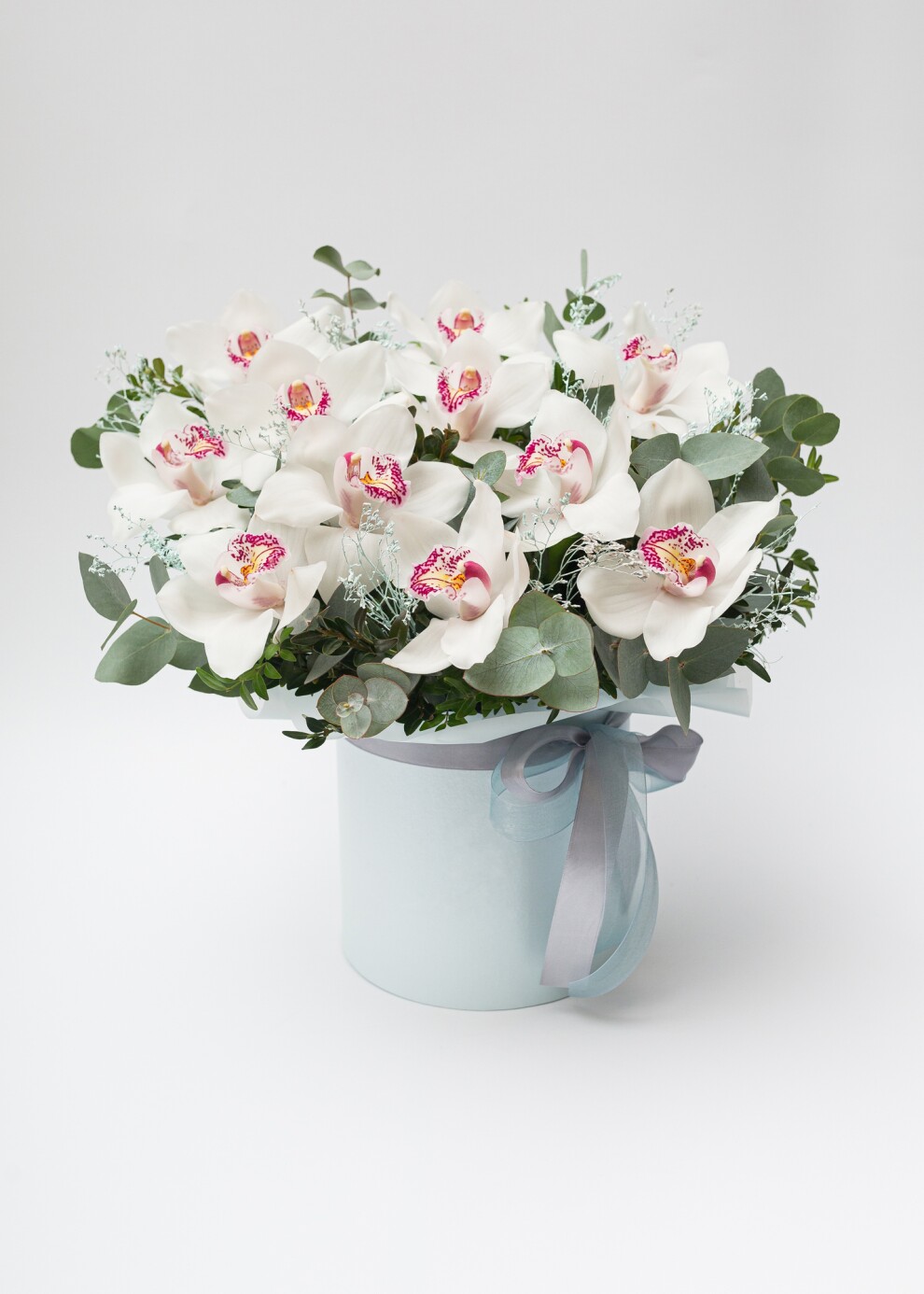 Моно-букет из орхидей, с лимониумом и эвкалиптом - 11шт.