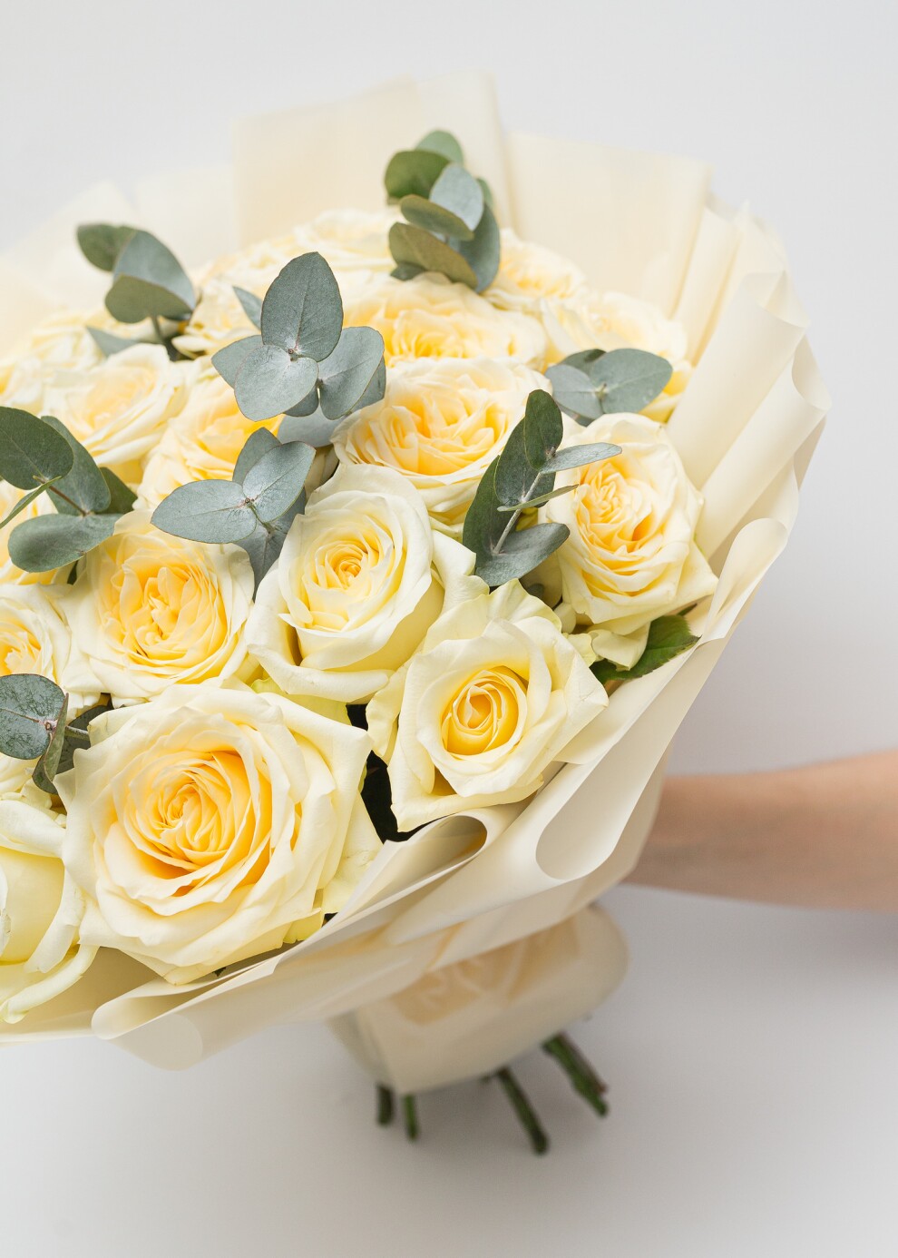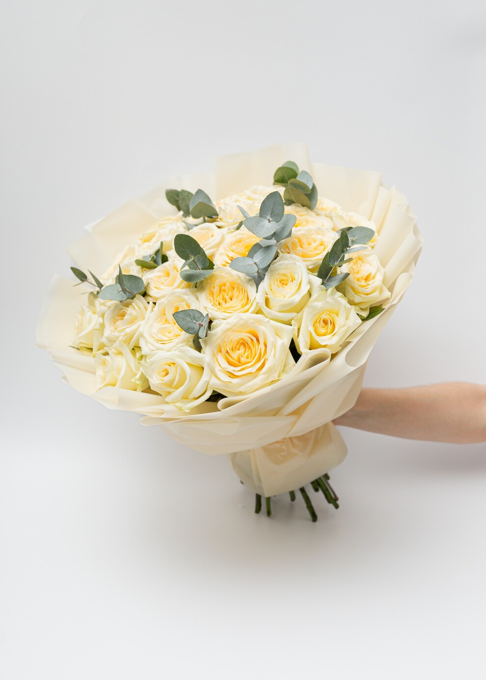 Классический моно-букет из пионовидных роз Candlelight с эвкалиптом, в нашей фирменной упаковке