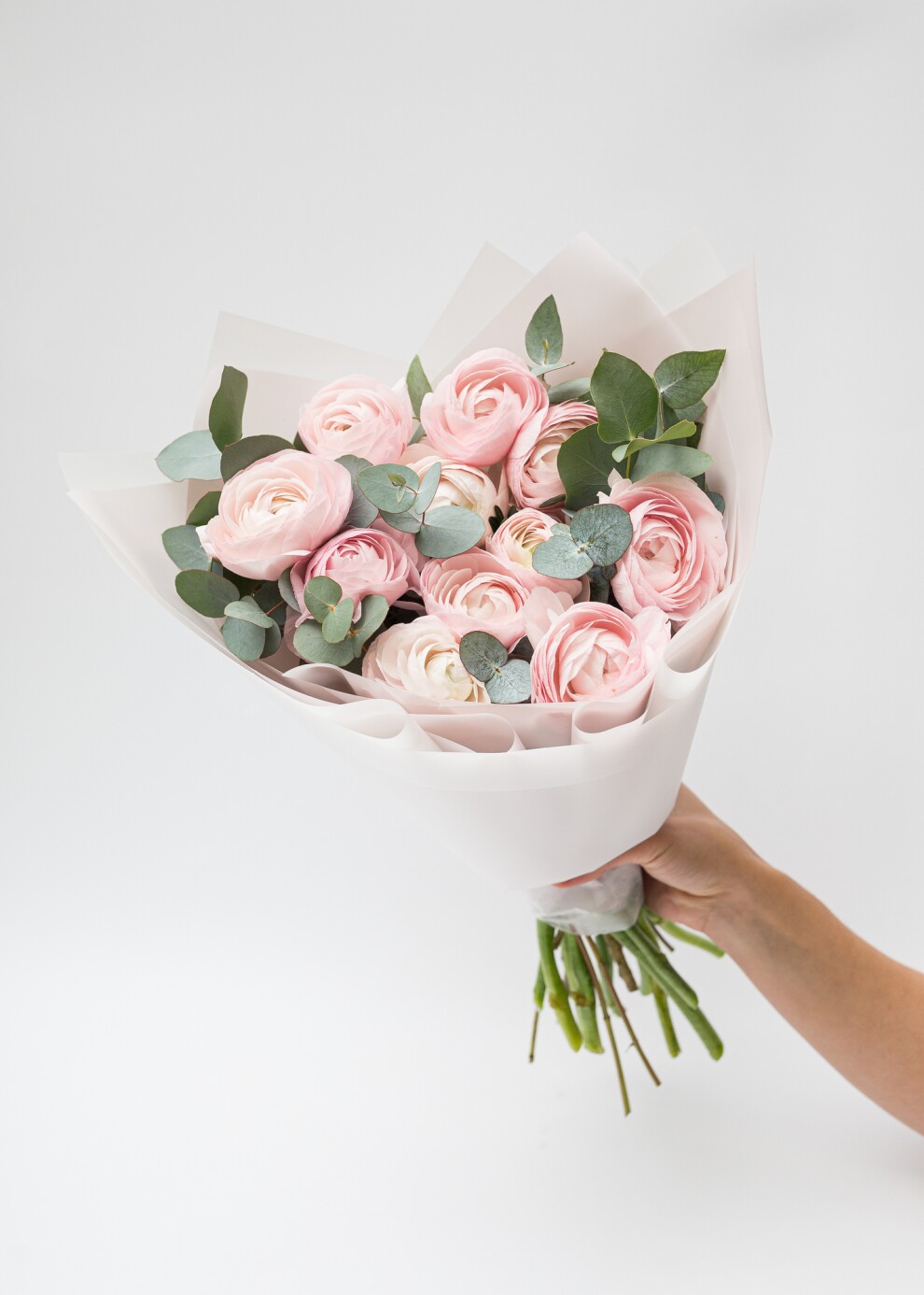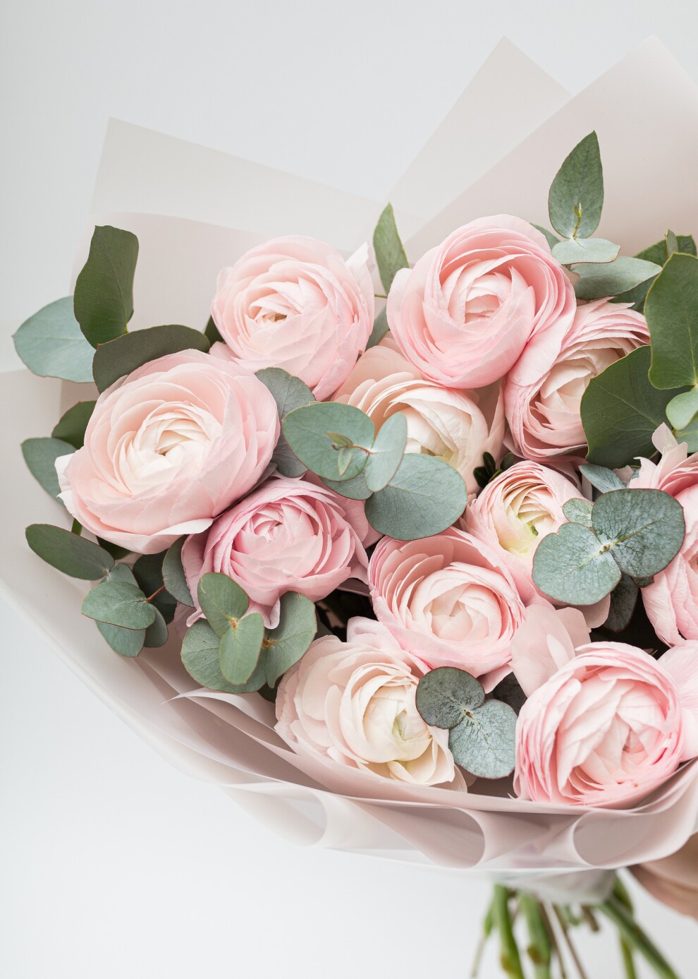 Моно-букет из ранункулюсов (лютиков) с эвкалиптом