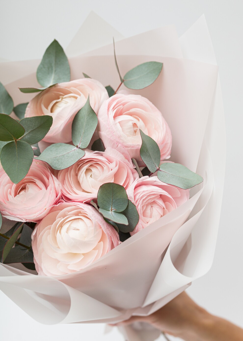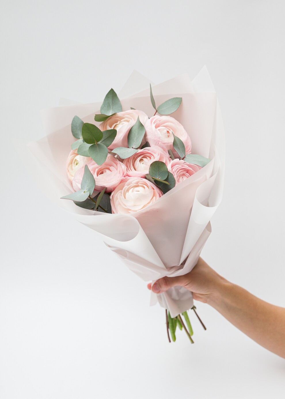 Моно-букет из ранункулюсов (лютиков) с эвкалиптом