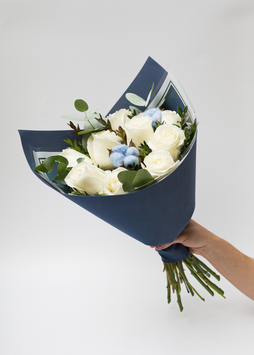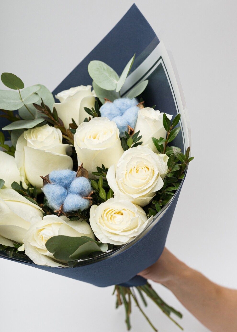 Классический моно-букет из роз с хлопком и эвкалиптом