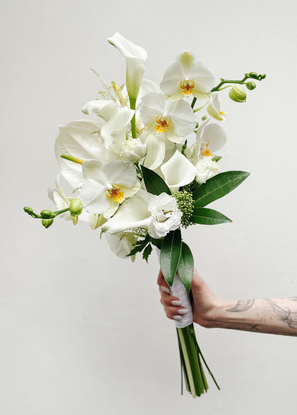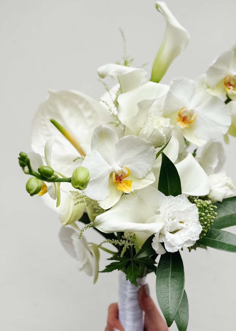 Букет невесты в кристально-белой гамме с экзотическими деталями