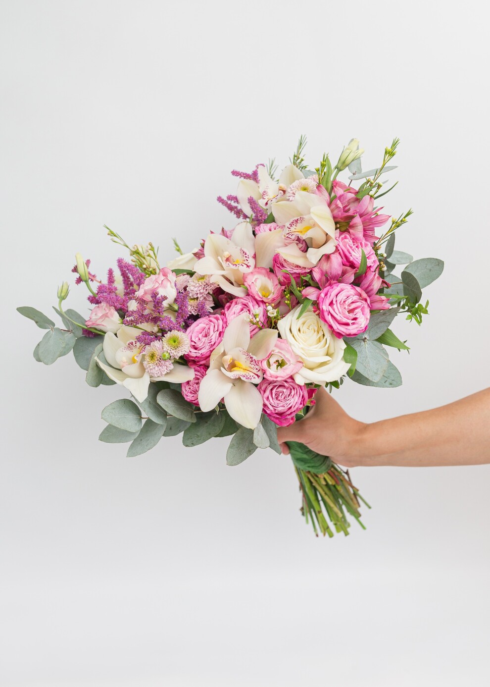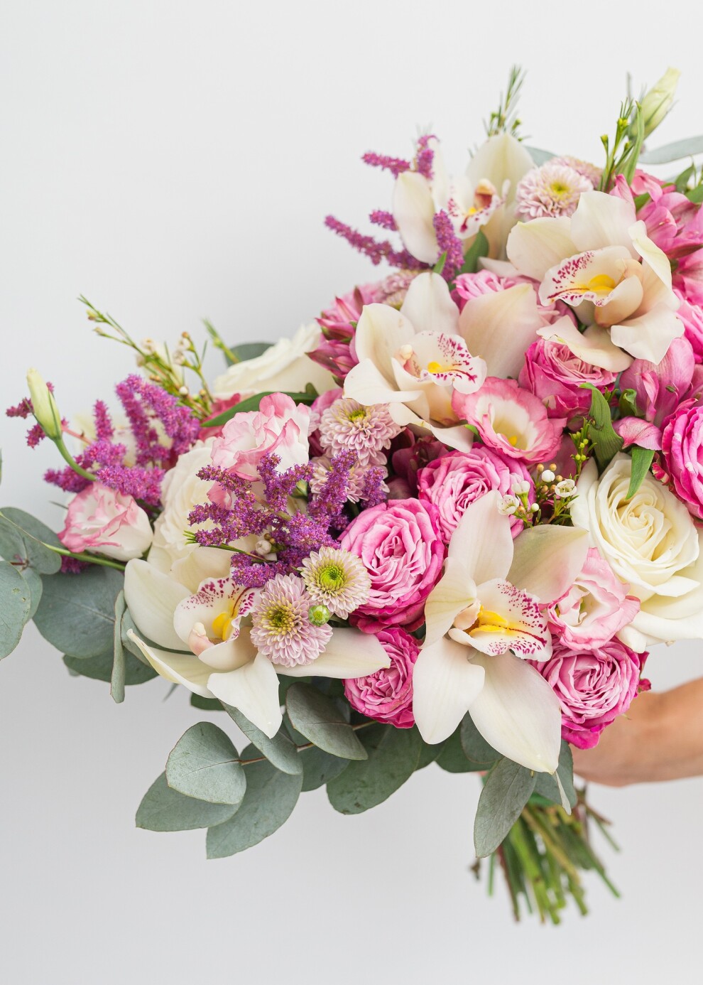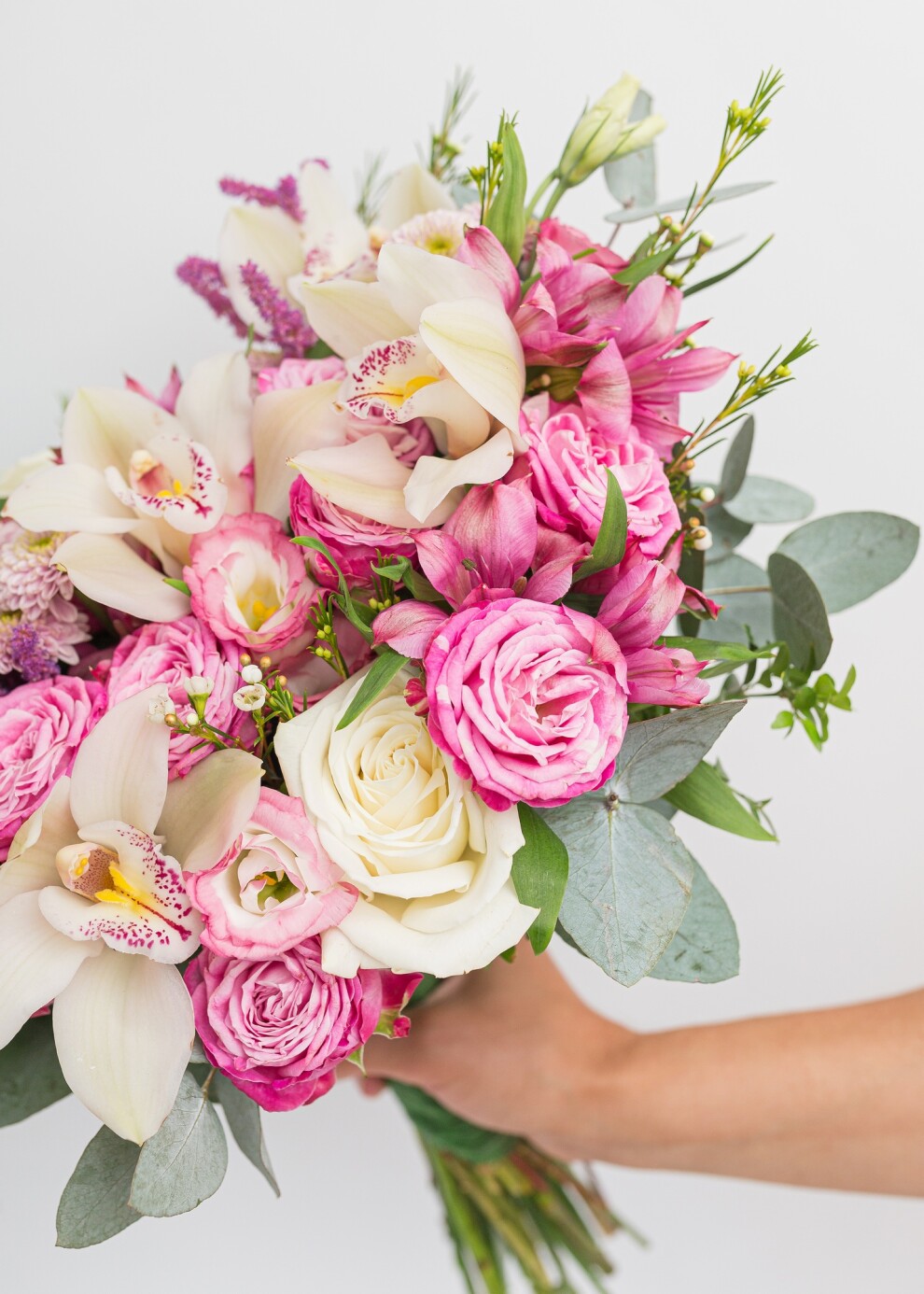Букет невесты в бело-малиновой гамме с эвкалиптом