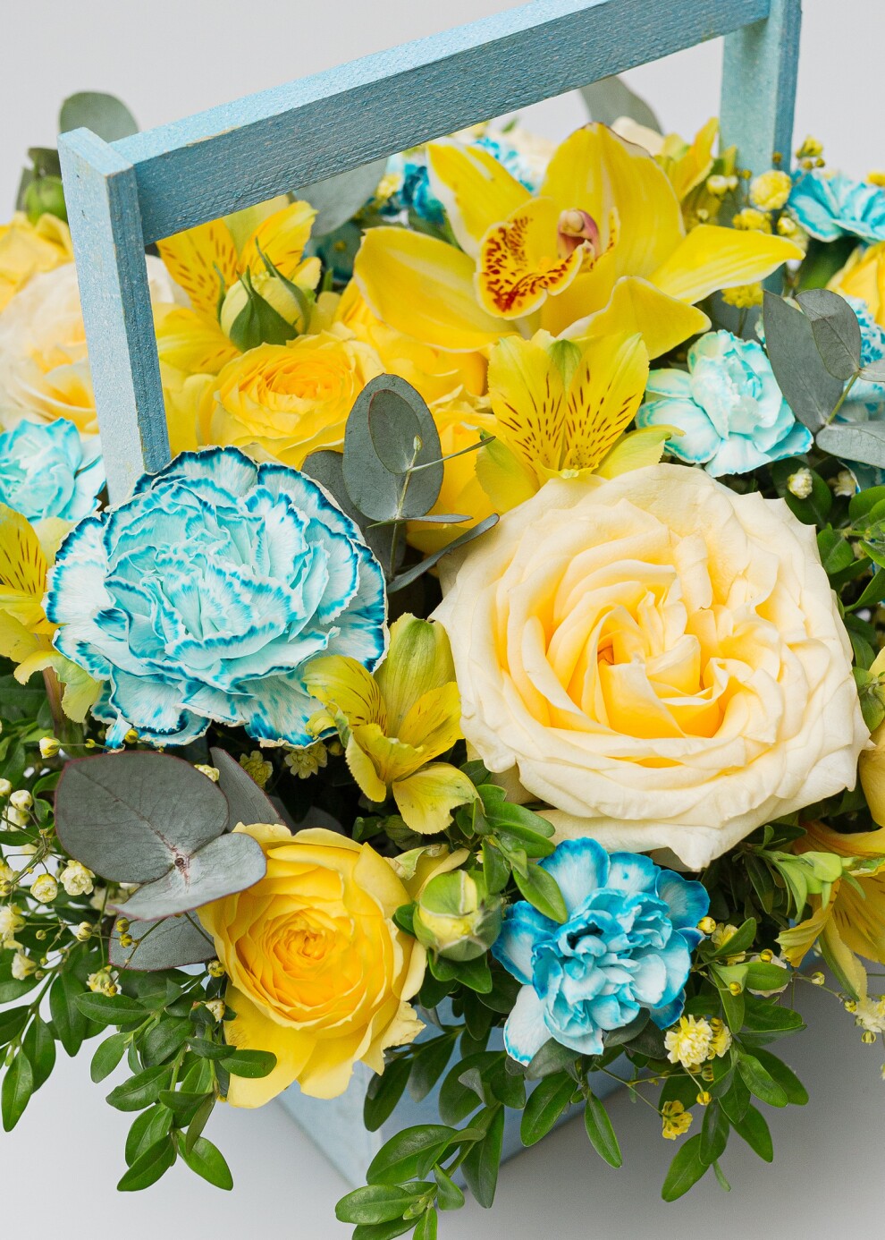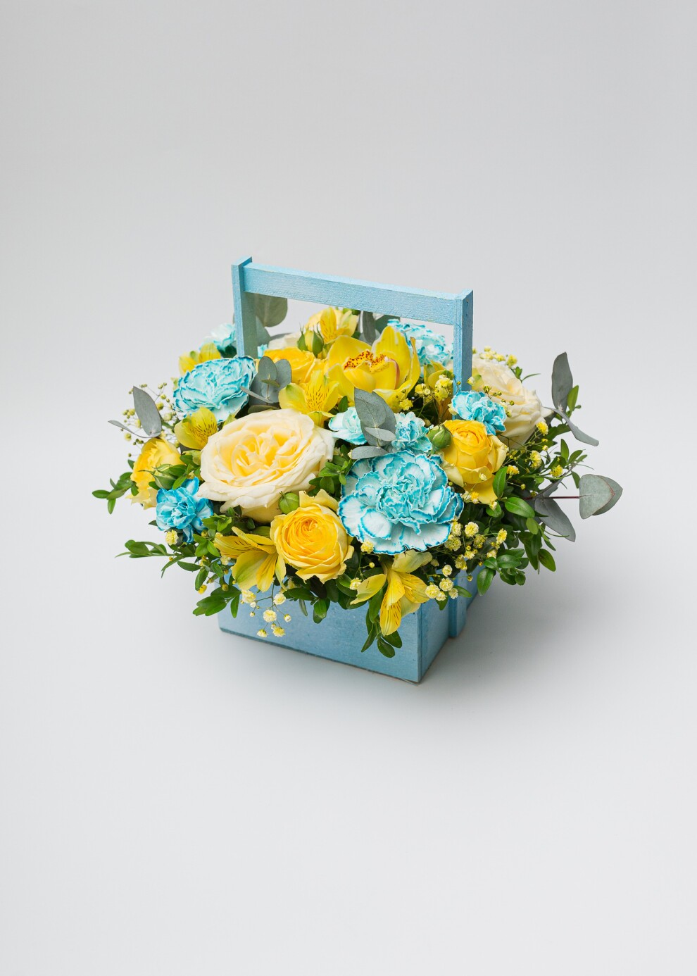 Яркое жёлто-голубое сочетание в деревянном ящике